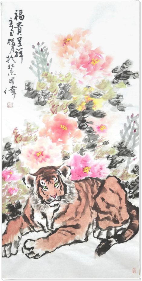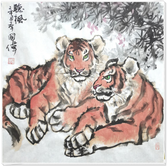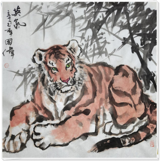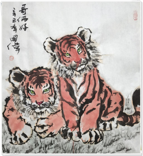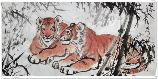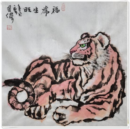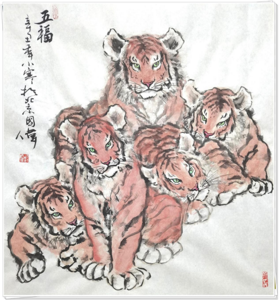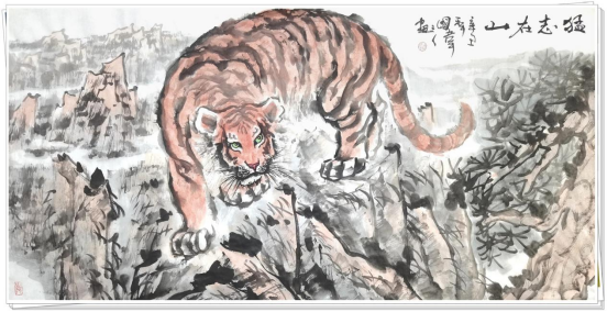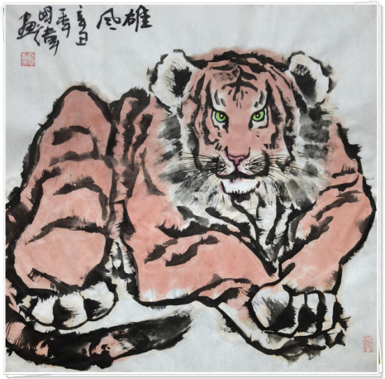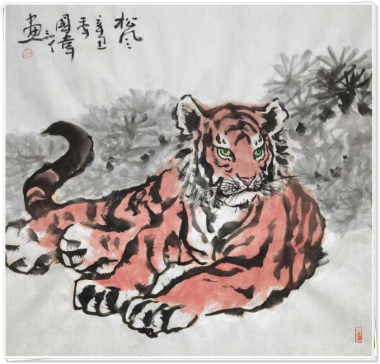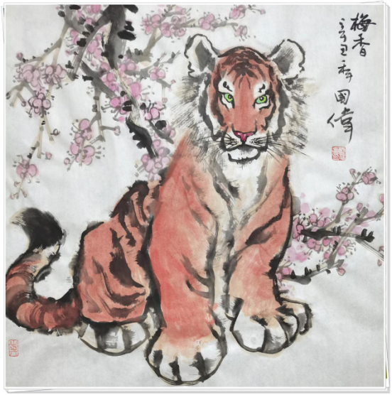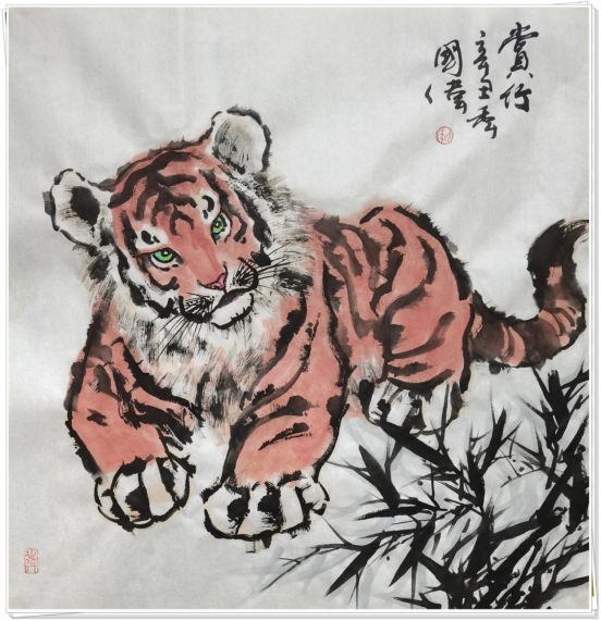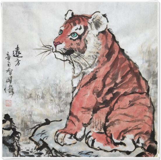 牛辞胜岁,虎跃新程。近期突然画虎的意愿比较强烈,不仅购买大量名家画册拜读临习,还利用周末到动物园观察老虎的动态,了解其生活习性,把师前人与师造化结合起来。作画时,参以篆隶笔意,用线重拙迟缓,干湿并用,追求金石趣味,以期做到古拙朴茂不失传统之感。同时,以朱砂渲染(传统民俗文化认为朱砂有辟邪守正的作用),力求产生视角上的冲击力,把山君的精气神描绘出来。 弹指一挥间,学画四十载,每个题材的创作都要经过不断的探索,画虎亦是如此。壬寅新春将至,祝福大家虎年吉祥。