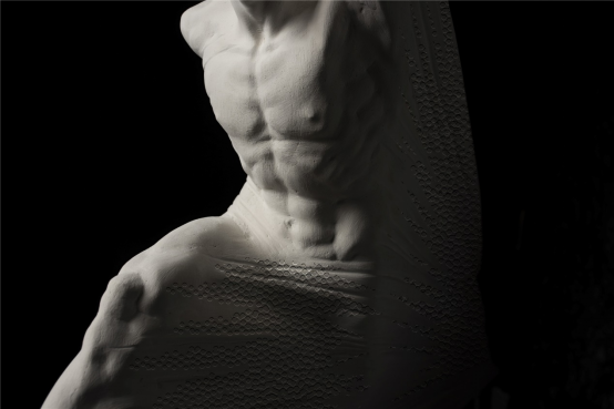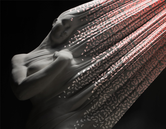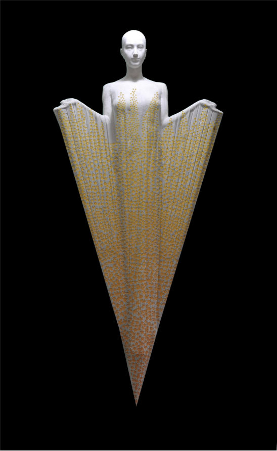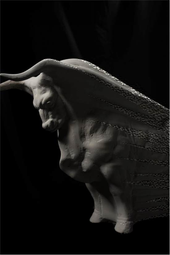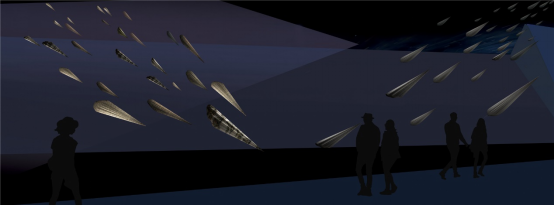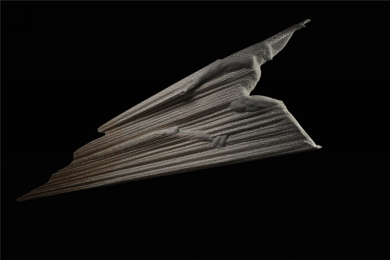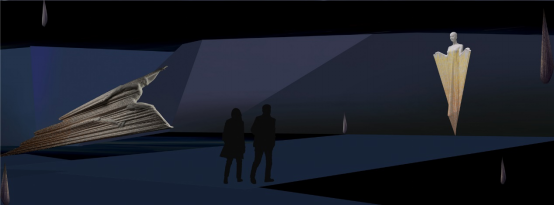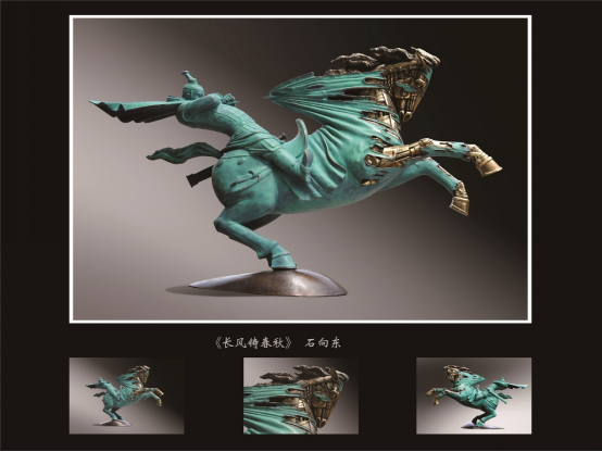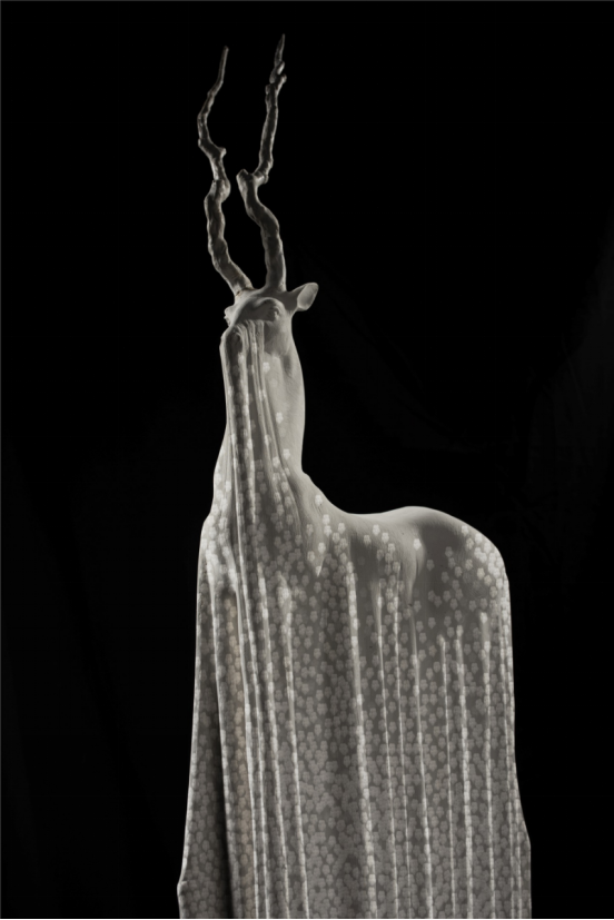 前 言 雕塑作品《融合》系列经过近三年的思考与创作最终得以完成。作品主题关乎于自然与人类,观照的对象是宇宙的物与人之关系。作品中塑造有两类物象:一类是诸如鹿、马、牛、蝶、花、草、树、石等具有自然属性的物,它们腾跃向上或向前,孕育着自然的韵律与节奏,象征着速度、激情与不可抗拒的生长,充满了风驰电掣般的原始爆发力;另一类是由男和女组成的人类,他们奔跑,虎虎生风,即便静止,也被风所包裹、缠绕与拉扯,彰显着力的抗争与较量。 塑造的物象被构置在四个独立的展馆内,意在营造幽蓝邈远的宇宙空间:第一个场景以石的构成为主,无数个飞石从天而降,拖着长长的射线,又弹将回到空中,它们悬浮于空中,极具视觉张力与运动节奏,象征着混沌初开、乾坤空净的宇宙运动。这个场景中所运用带着风的射线造型语言奠定了全场四个场景物象造型的基础,为其他场景中的物象造型都从石的造型演化出来,而且贯连在每一个场景之中。第二个场景分布着鹿、牛、马等形象,奔突升腾,昭示自然预示花草鸟兽,繁衍不止,生生不息;第三个场景和第四个场景由四组人物构成:一组是位于中央的构成蝴蝶造型的男女形象,另一组是分列蝴蝶两侧的腾跃而起的男女形象;一组是向前跨越奔跑的男人,另一组是从落叶中慢慢裸露的女人,这四组形象象征着顺遂时序,生长收藏,永不衰竭。自然界中的天、地、人和合而生,正如《易经》所谓:“天之道在于始万物”“地之道在于生万物”“人之道在于成万物”。 《融合》作品力图发掘所塑造物象的“物性”,同时,试图营造天地人相生相合、物我两化之意蕴,表达对于传统文化精神的艺术情思,寄寓心灵自由、超然物外、妙造自然的精神境界。