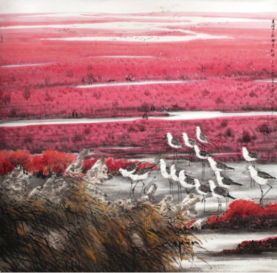 他的一批学生和同道深深地被他的画吸引,追随他的足迹,与他共同研讨,以爱家乡、爱艺术、爱生活为共同情感,以艺术为家乡服务、为百姓服务为共同追求,相互批评,相互砥砺,取长补短,渐成风气,自然形成了一个富有地方特色,富有生机活力的画派——黄河口湿地画派。四年来,他们下农村,去企业,进军营,入学校为人民服务,每年举办一场大型研讨画展,同时,受邀赴杭州、济南、郑州、菏泽、淄博、滨州等地举办黄河口湿地画派全国巡回展,每到一处,他们的画都以崭新的面貌、清新的风格、成熟的画风得到当地观者和专家的高度赞扬,甚至以画为媒引来很多观者纷纷到黄河入海口旅游观光,极大地推介和宣传了美丽的家乡黄河口,成为东营一张靓丽的文化名片。