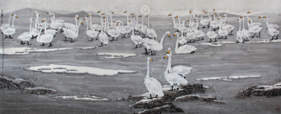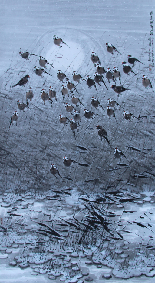 20多年来,寒来暑往,晨昏夜明,他就像个痴情土地的老农,以笔为锄,以墨为镐,在艺术的土地上深耕细作,废纸三千,汗水无量,不断探索,不断创新,终成自家面貌。2011年,正值黄河三角洲开发被列为黄蓝战略之际,在市委宣传部、市文联的关心支持下,他在黄河美术馆举办了以“爱我家乡”为主题的个人画展,这是蛰居多年的第一次集中亮相,100多幅黄河口湿地题材的作品,质朴,清新,生动,博大,辽远,唯美,以强大的冲击力让观者大为震惊,各大媒体纷纷报道,业内人士交口称赞。