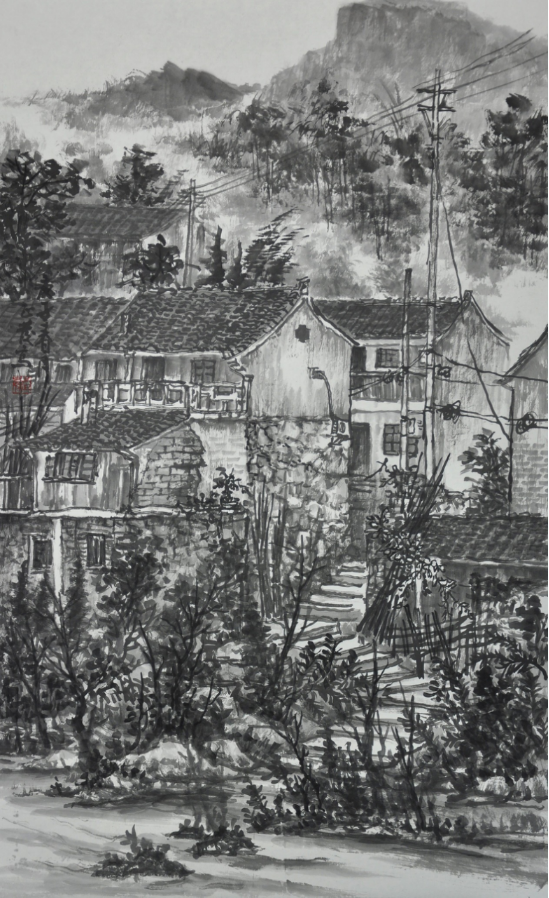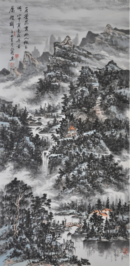 成功之山水画家,必然多以家山为创作对象,这显然是一个相对主义的论断。山水画家内心藏千山万水,无论是视觉经验的世界山水,还是超验的灵感世界山水,一起皆统摄于他的笔端。纵观朱正发先生多年的山水画创作,无不验证这一亘古不灭之艺道宏规。余观乎其家山写生墨稿,笔墨之精妙,取景之匠心独运,无不让人惊叹。石涛云:“笔非生活不神,墨非蒙养不灵。”画家朱正发先生亦与生活蒙养而有所悟也,若不臻于此境,其笔锋下何以决出生活,画幅中何以寄予性灵。他的《句容胜景图》、《茅山颂》、《秀色江南》、《烟雨瓦屋山》、《赤山印象》等家山系列之作品,更是以神思与禅悟,以及生活与蒙养之情境来创作的。除此之外,他还有许多以祖国大江南北的山水与古迹名胜,乃至古诗为其师造化。如《太行人家》、《万年浦江》、《层林尽染》等作品。