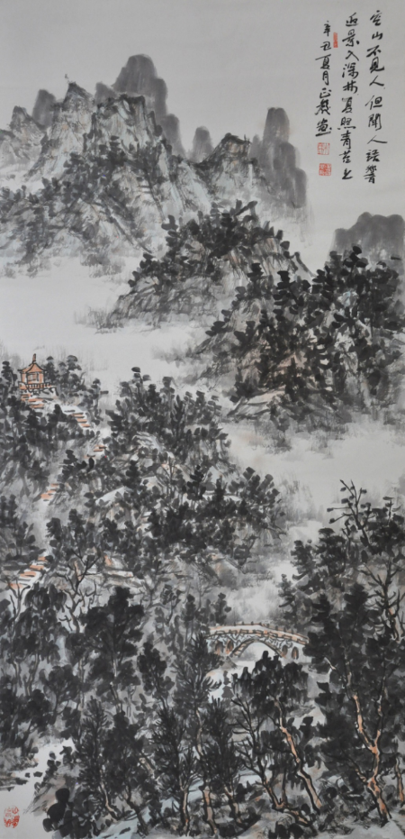 朱正发先生,是著名山水画家。山水画对于世界文艺而言,不仅是绘画,更是人文现象,又缘于山水画隶生于中国古典哲学系统。故宋代之邓椿云,“画乃文之极也”。刘勰又云:“人文之元,肇自太极,幽赞神明,易象惟先。”山水画又乃人文山水之意象也,因此之故,人文意象之山水乃画家之精神家园。朱正发的笔下山水,不仅是笔情墨趣所描绘的家山梦境,更是维系中华民族五千年美丽家园的蓝图。亦有人声称,文艺作品的核心思想都是由乡愁而缘起。笔者也认为,朱正发的山水画也是由乡愁而慢慢展开的,他对家乡句容有着十分浓郁的感情,这也来自他作为艺术家的一颗赤子之心。