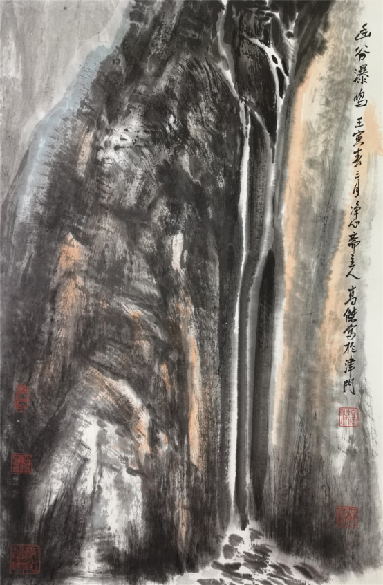神灵气行,情致自生,连绵相传,势脉贯通,气韵自然生动。高杰的《黄河之水天上来》、《碧海惊涛》画的都是水势。整个画面,瀑布飞溅波澜汹涌,飞扬升腾气势雄伟。高杰正是用虚中含实,实中有虚,阴阳相济的中华传统辩证理念,以缥缈混沌的皴法,画出了瀑布的汹涌澎湃和万马奔腾的雄浑之势。把中国画技法的虚与实,气与韵处理得恰到好处,如无画水则情溢于水的真性情,是很难达到神往无穷之艺术境界的。