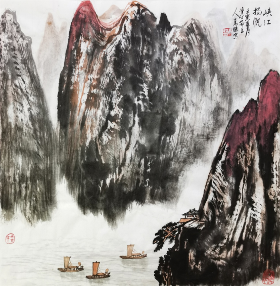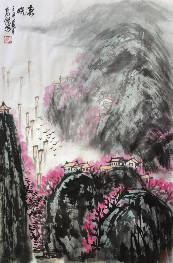 巧用染法,色彩明快是高杰先生山水画艺术特色的另一亮点。他的山水画作品《两只蝴蝶》、《道法自然》、《清幽》和《高原格桑花》,都是用的不同的染法。以浓、淡、干、湿、凝、渍的变化,积染而不死板,淋漓而不臃肿,画出了中国画传统的“笔情墨趣”。高杰先生在山水画创作中努力追求的是苍茫厚重中不失灵动,轻灵缥缈间又不失厚重,色彩斑斓而不失传统底蕴。因此给人以赏心悦目,清新明快,大气厚重的欣赏欢娱。