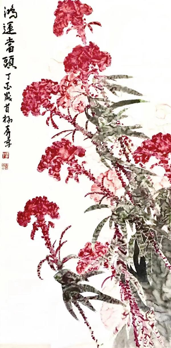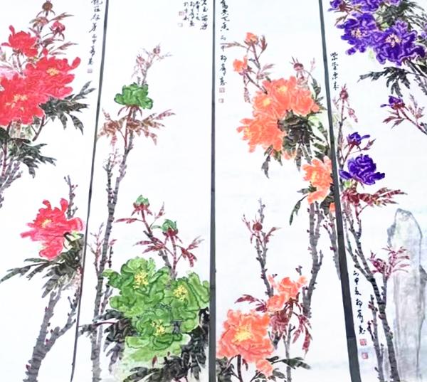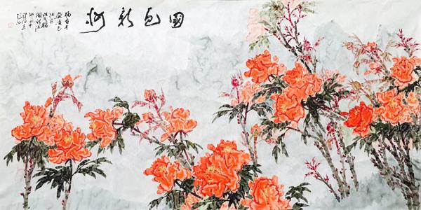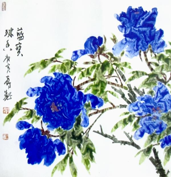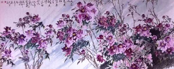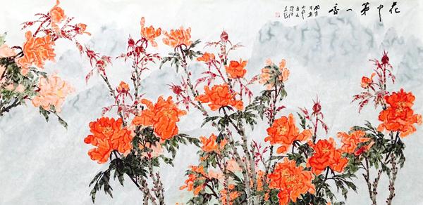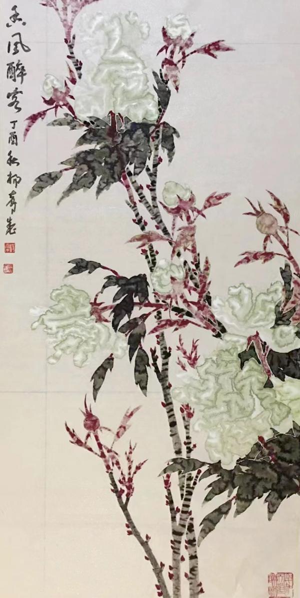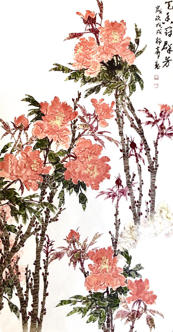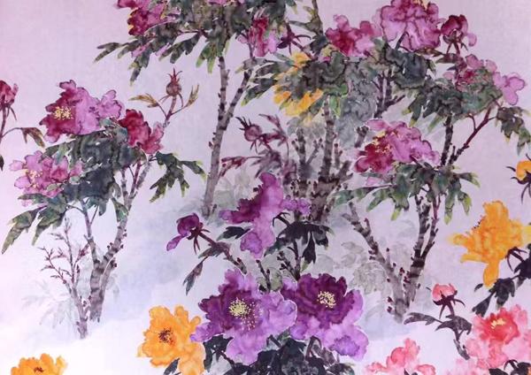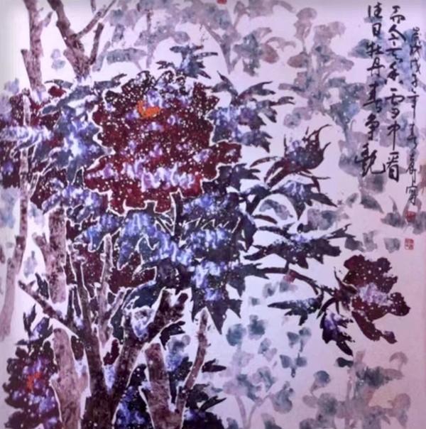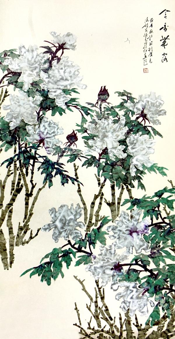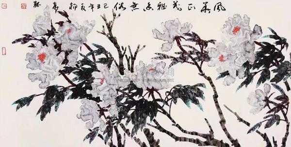他三十五年如一日与牡丹相伴,解其华骨,构思贵魂,独创渍色牡丹。其专从骨入枝,从神建蕊,以渍色状花魂,或枝瘦花肥,或花润枝沧,清香袅袅、意境深远。