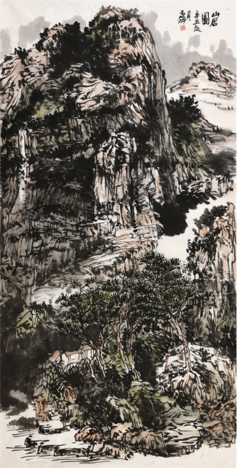 显然,深得黄宾虹艺术启悟的张玉锋,在实践中获得了灵性与感受,尤其领会了“千笔万笔,无笔不简”,“三笔两笔,无笔不繁”的要义与写意的逻辑运动规律,画面中山川的处理,清晰却又云雾飘忽,整体浑然氤氲却又点景清楚。而画面中山水意象,则曲直、大小、高低、方圆与章法布势中的主次、疏密、虚实、远近,以及笔墨的浓淡、干湿、焦宿、积泼等,都表现为矛盾的对立统一的活跃与和谐,用于构建画面的波澜起伏;细看作品,不难发现,其用笔墨多先用淡湿墨线勾出山石树木轮廓;再用湿墨浓淡并用地点染冲破,反复多遍,使之层层深厚;然后再用较浓的墨点皴树叶、山石和复勾树干、添加枝条藤蔓;最后再用枯笔皴擦,焦墨点醒;在用墨上,以湿墨为主,尤以宿墨、泼墨和渍墨突出,与此同时,又用干墨、焦墨皴擦;结果,画面浑厚苍茫、拙重幽邃。