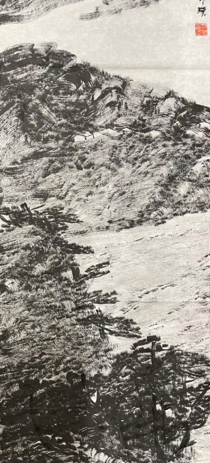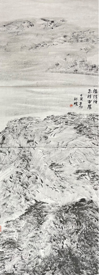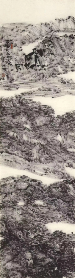 王祥夫:焦墨艺术的视觉感觉是霸悍的,但你的焦墨山水的好处却在于有特别轻灵的表现。这让我想起已经故去的京剧演员袁世海,他特别的会演戏,他演李逵,就能于霸悍之气中表现在出那么一点点极其可爱的妩媚来。我特别留意你的焦墨山水轻灵的用笔的部位。那是一种很妙的感觉。肯定一点,国画家都不能做立体主义者,国画是前后左右,我们都不能像油画那样走到立体主义里边去,但我记着你的一幅画是画了一个平坡,那是一个很大胆的构图,从中我看出立体主义的味道来了。我很喜欢那幅画。这不是一幅“动手”的作品,这是一幅动“感觉”的作品。我一看这幅画就觉得你有了。