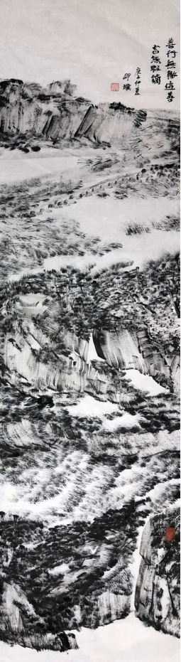 邵璞:你的世界观、你的灵魂是你的主宰,主宰最重要。如果说老师,张仃先生无疑是我的启蒙老师,如果说我的焦墨艺术,还有数上诸多老师:陆俨少先生、傅抱石先生、范曾先生、吴长江先生、李翔先生、王界山先生、中国美术评论家邵大箴先生、尚辉先生、梁江先生、陈履生先生,中国文联的郭运德先生,《人民日报》邵剑武先生……,很多在不同时刻给过我致命的批评、启迪和鼓励。一个艺术的进步需要很多方面,很多方面都要有大师提携和指点,在商海,我接触到一般艺术家不可能接触到的苛刻的培训,在中央台和《文艺报》我得以伴行中国当代最高成就的作家艺术家10年,这是我艺术有别于其他一般艺术面貌的又一个根本的因素,可以说:作家、商人的犀利境界、节操、眼光深深影响了我,没有一般温室的软骨病、酸性,我与生活中的佼佼者更接近,或者说我与他们如出一辙。画家、中国文联艺术委员会主任丁杰先生看到我去年作品时评价的第一句话是:“你的画格调高。”
