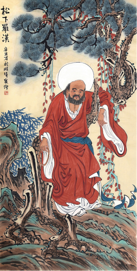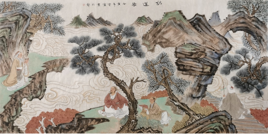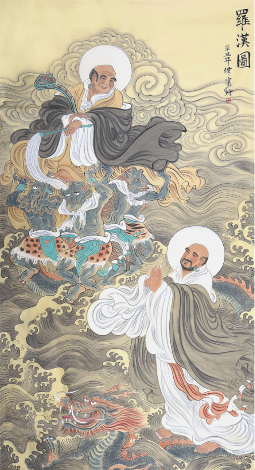 我们不妨欣赏下王伟宾的道释人物画。先看其用笔用线,他以游丝描、铁线描、莼菜描等描法塑造人物,信手拈来,纤毫毕现,准确生动,纯熟自然,显示出深厚的传统功底;若深入去看,由“笔势”转化为“线势”进而形成一种“画势”,势不可挡,扑面而来,使人观之,犹闻其声,可察其动。再看其用色,在传统赋色基础上,他依据不同的道释人物与绘画主题,采用不同的设色方法,或重彩或淡彩,或勾染或晕染,使色彩更加丰富,灵活多变。由此,他将对道释人物性格表现寓于环境、气氛、姿态、线条以及墨与色的渲染之中,已达形神兼备。