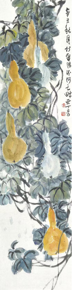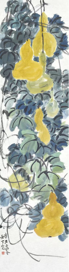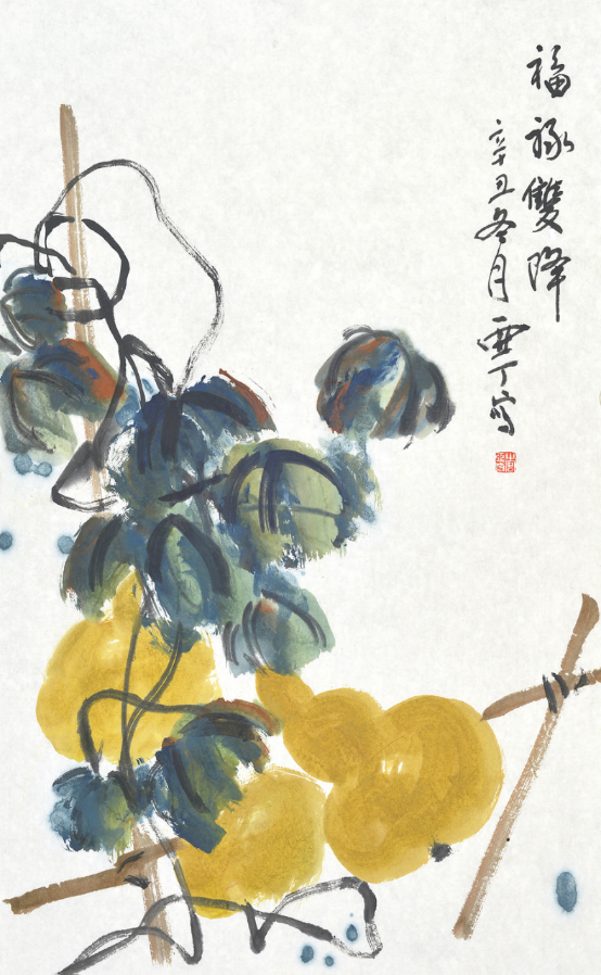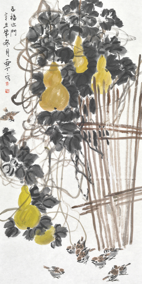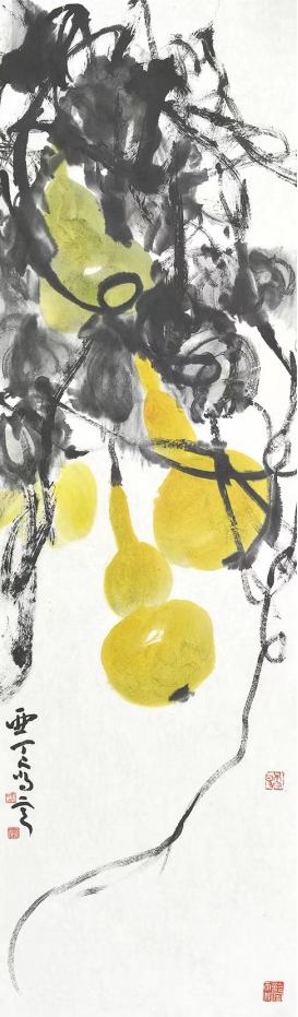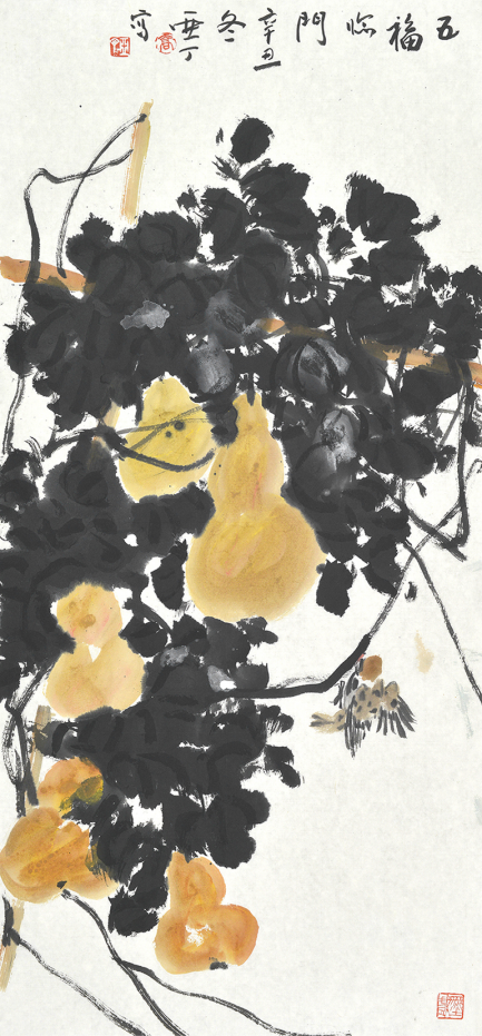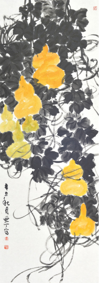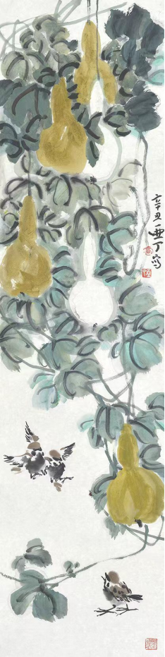 乔亚丁先生长期深耕于中国花鸟画创作,在守正创新中执着追求、大胆探索,在师承前人的基础上重视写生、师古而不泥古,尤其注重中国画传统与创新的有机结合,使其花鸟画从形式到笔墨都有独到之处,形成了自己独特的艺术特点。 正因此,我们深为乔亚丁先生在绘画艺术上表现出的才情学识、取得的艺术成就所折服,遂向乔亚丁先生约稿,同时也是以此表达由衷的敬仰和钦佩。《葫芦》专题画一组,供书画界同仁和花鸟画爱好者欣赏。 葫芦与“福禄”谐音,取“福禄双全”的吉祥寓意,同时有积财聚财、多子多福的内涵用意,象征着家族人丁兴旺,子孙延绵。可以说,葫芦自古以来便是人们心目中增寿、降瑞、保福的吉祥物,代表了中华优秀传统文化的精髓和特质。 观乔亚丁先生这一组《葫芦》专题画,每一件作品都满溢着生活情趣,浓艳的柠檬黄和厚重的墨色叶形成强烈反差,色墨淋漓,光彩灿烂,画面气氛十分热烈,不论构图、画意还是行笔、着色,皆韵味绵长、传神高妙,无不给人以极大的艺术享受,不禁让人由衷感受到“因喜葫芦能解笑”。