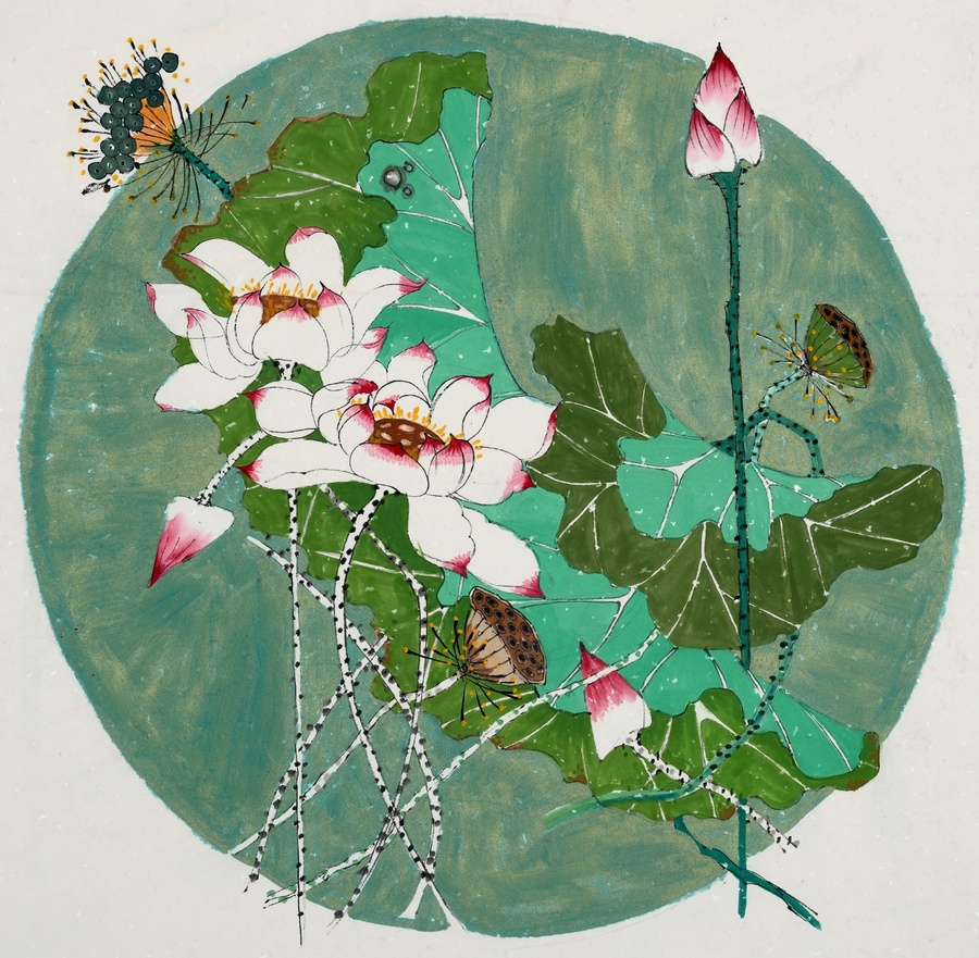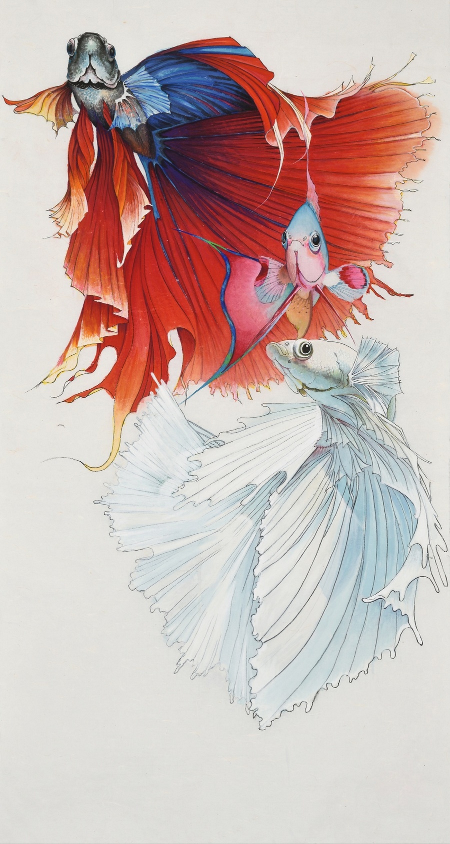 邹老师笔下的鱼:自喻为龙鳞飞天潜龙出水或一跃而起,或迎风破浪,或裙裾摇摆如西施浣纱,或寻觅或回眸如青衣甩袖,在大海与天空之间翩翩起舞似潜龙出海。让人不禁感叹:这世间真有龙女在世?真有美人鱼在追求世间的王子!我也曾和老师探讨过,是否把他笔下的鱼上半身改为女人…