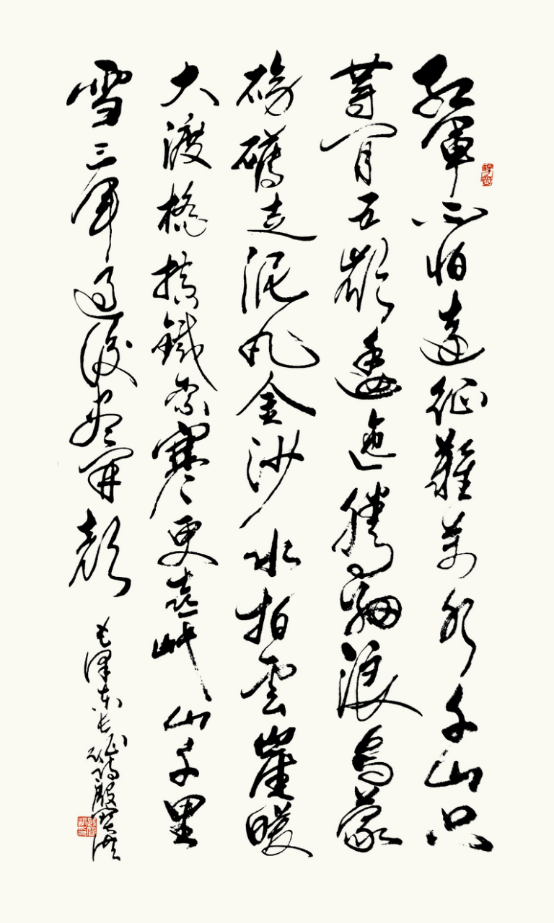 《长征》 释文 红军不怕远征难,万水千山只等闲。 五岭逶迤腾细浪,乌蒙磅礴走泥丸。 金沙水拍云崖暖,大渡桥横铁索寒。 更喜岷山千里雪,三军过后尽开颜。
