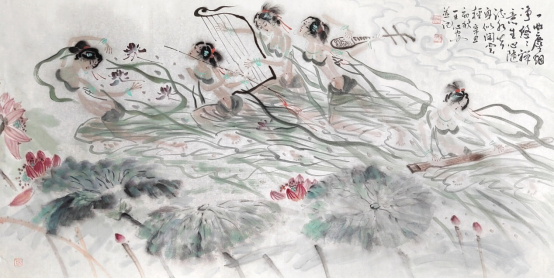 《山东人》:《飞天》系列作品表现的是怎样的审美趣味和宗教情怀? 王心安:《飞天》作品具有中国传统的审美意味,她具有浪漫主义色彩,是人们的美好向往,是丝绸之路上的飞跃天堑之梦想,是中国人一直以来的中国飞天梦。飞天是人格化了的神,是神格化了的人。其次,飞天具有唯美主义倾向,表现人类自身的完美,并突破人的局限性,把现实生活诗意化,将人间塑造成天国家园。再者,以飞天人物为载体,表现国画本身的笔墨趣味,相得益彰。 宗教画是东西方绘画的主要题材之一。《飞天》属于宗教画的一部分。希腊女神是维纳斯,飞天则是中国的美神。飞天是佛教中的飞神,主要司职向人间降福降寿,散幸福花,传吉祥乐,是和谐、美好、幸福的象征。