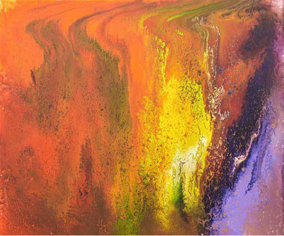 “远取其势,近取其质”,承强深知“真放在精微”,在肆意释怀的同时,他更注重画面的精微,于豪放中见精微,于精微中见豪放。在《紫气东来》中,大片流彩蜿蜒逶迤,时急时缓,时开时合,在优雅的紫色旋律中奏出悠扬的乐章。近处棕褐色的点彩沉着淋漓,攒三聚五,错落有致,层层叠叠,宛如冬日从林,寂静苍凉。细观这些点的处理,或聚或散,或疏或密,或争或让,或浓或淡,别出心机而生动自然。承强的“精微”不是对细枝末节的精细描绘,而是体现在对画面构成元素之间的节奏、虚实、轻重等关系精妙把控。“妙算毫厘得天契”,承强的抽象艺术正是在“豪放”与“精微”辨证中阐述“致广大,尽精微”的艺术精神。