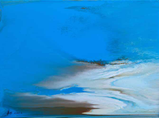 承强在油彩抽象绘画上所取得的成就,得益于其长期的山水画深入学习与中国传统文化的熏陶。中国山水画承载了中国文化深厚的民族精神与审美理想,与中国哲学中核心的精神“道”紧密相连。承强正是在山水画中汲取了中国传统文化的精髓,将自然造化作为自己“神游”的理想天。他的作品既展现自然造化的大美,又表现自己内在的性情与精神,将自己的内心心境与自然物象合而为一。在其作品《云心水性》、《潮涌》中,云水相拥,一动一静,动者翻腾奔放,静者浩渺弥漫,动者益动,静者益静,形成了云随水动、水随云流的卓绝意境,传达出东方哲学天人合一、道法自然之思想。承强的抽象艺术虽源于中国传统文化,但不是模仿前人形式语言与技法,而是基于传统精神上的创新。观看他的作品,其越抽象、越趋于无形,越感觉接近中国传统的绘画思想,他以抽象绘画语言阐述中国传统文化精神。他的抽象艺术是从中国传统文化中汲取营养,融合当代审美气息,最终形成了蕴含中国传统艺术精髓的抒情抽象绘画。