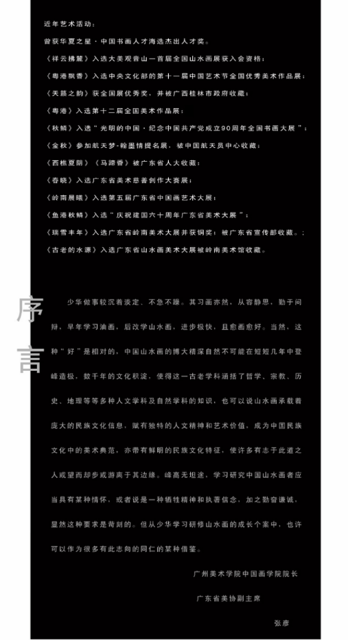 黄少华,现为北京首都书画院理事及画家,中国书画报特聘画家,中国美协会员,广东省市美术家协会会员,广州市美协综合材料绘画艺委会委员,广州市美协中国画画艺委会委员,广州美术学院中国画学院外聘副教授,毕业后留校任教至今。