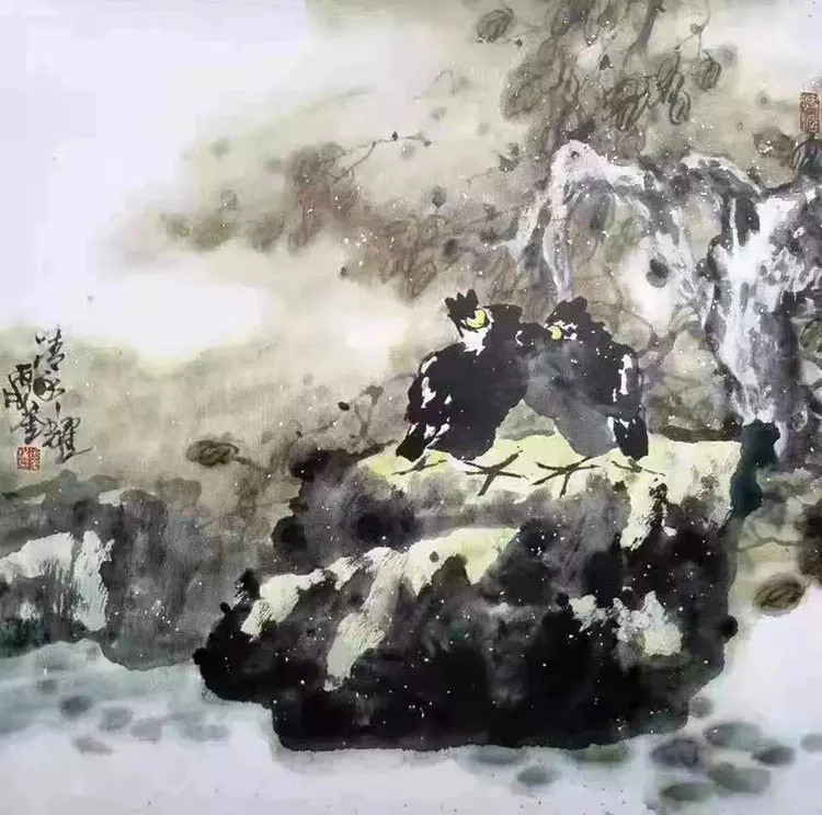 张奎耀的审美选择与艺术倾向,都体现在作品中。他的花鸟画,常常把主体意象——鸟置放在寂寞无人的空山幽毅,似乎在聆听令人心醉的天籁之音;不难看到,这种苍茫浑然的氛围之中,画家还表达着一种孤陋。画家是在面对红尘滚滚的世界,在艺术中寻找孤独的。许多人都懂得,现代艺术中的孤独与无人之境,是一种特殊的生命体验,是孤独背后的充溢着生命活力的世界。