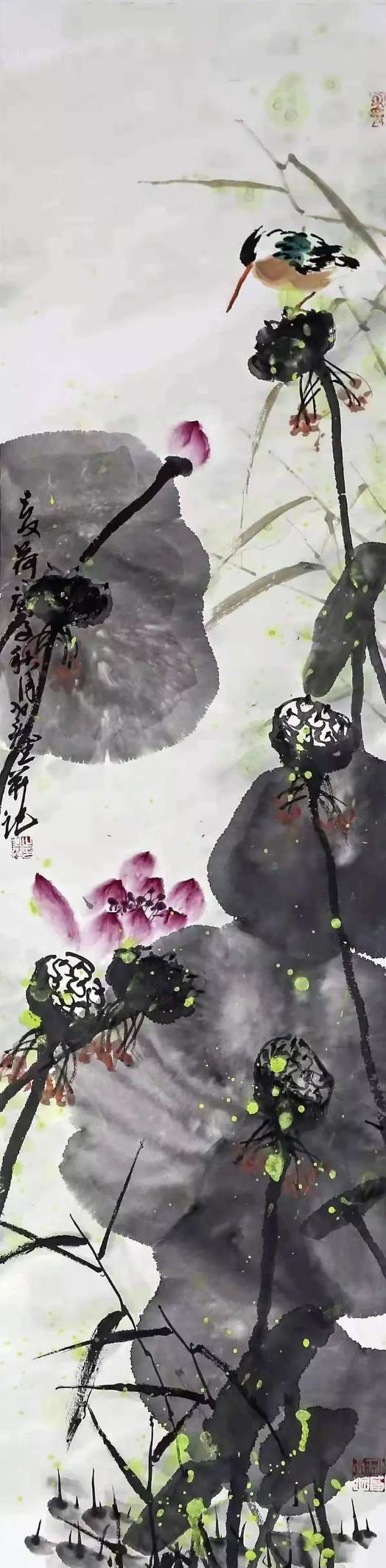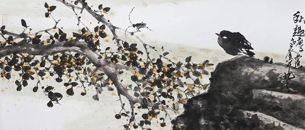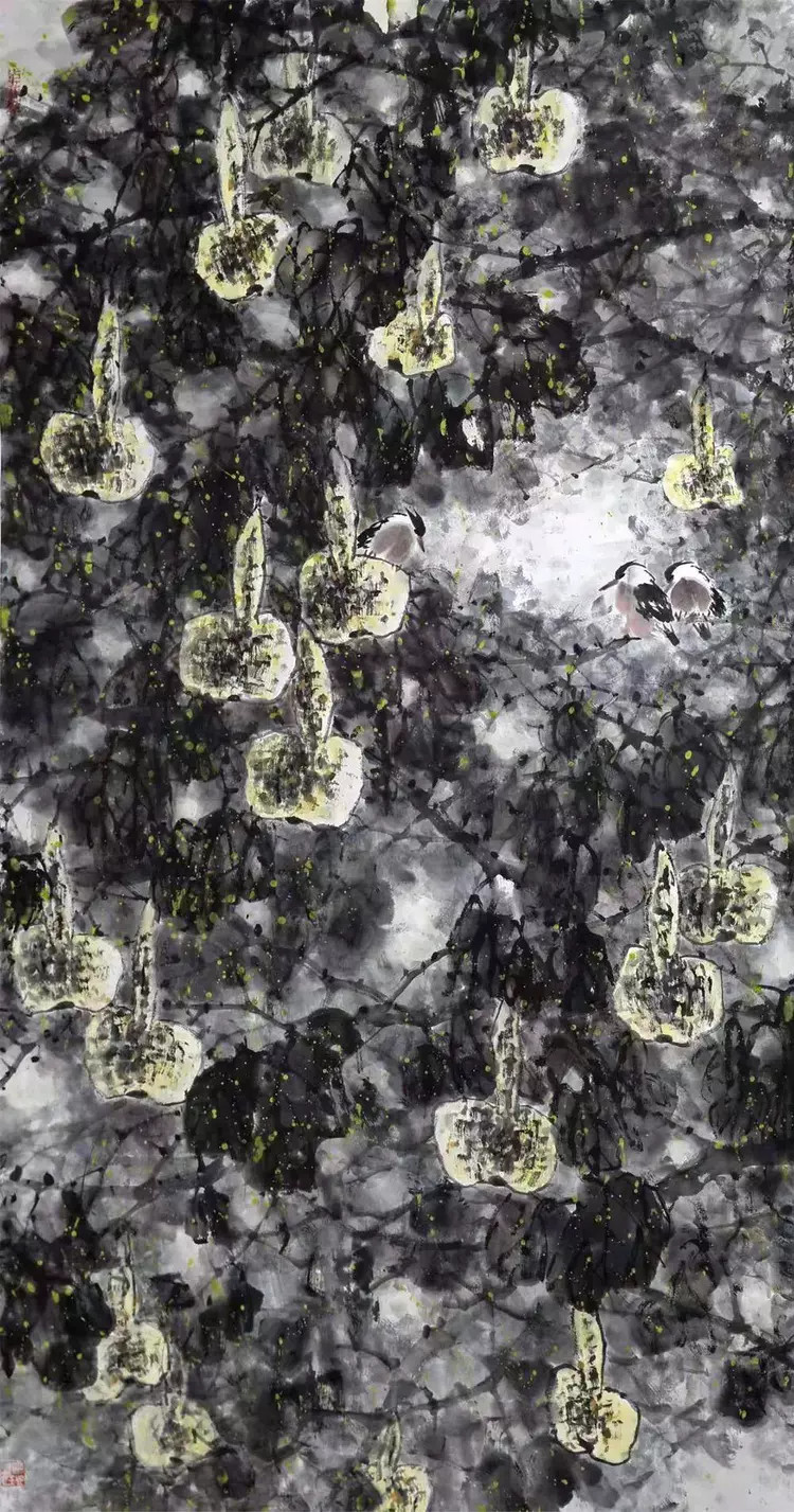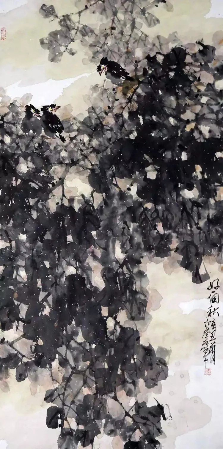 这种黑、白、灰的水墨世界,把作品的总体情境引向了苍茫。 这种苍茫境界的营造,使花鸟画获得广阔的精神空间。浑朴之美,它与人的心灵相通。就笔墨语言而言,画家多用湿笔淡墨,以水墨渲染,然后再以湿笔墨勾勒、皴擦、点染,造成秋塘、灌木、杂树、草虫的迷意象,使折枝的花鸟一扫简单、寡陋的面貌,而展示为一种境界,一种氛围,一种情调与一种气象,使之更开阔,更深远,更心灵化,体现出独特的,也是感人的苍茫境界。