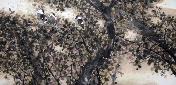 而且,花鸟画中引入山水画的空灵、荒寒,甚至幽寂的气息与情调,使花鸟画具有了更丰厚的内涵与深刻的表现力。画家张奎耀的花鸟画正是因此而获得了生命的美质情调,他的探索、实验与实践,自然而然地转换为美感与情怀,使他的作品获得了一种心灵体验中的幻景——一种美的感觉。在黑、白、灰色的交融、构成中,提取的是一种生命的抽象节奏,如此才有了《秋塘之趣》、《秋趣》、《秋》、《松间》等作品,这些作品在总体上代表了画家艺术取向、审美选择与风格特征。
