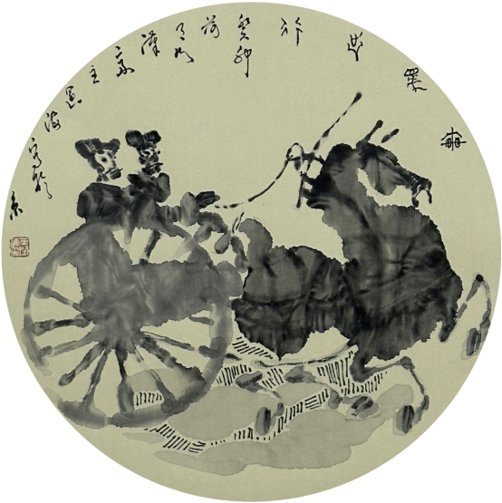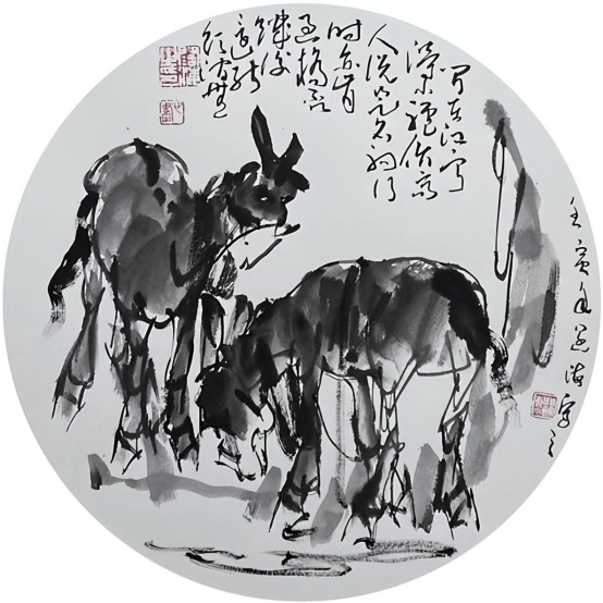 可染先生的山水画深得西画光影和焦点透视的影响,有的作品刻意追求西画的光影效果,虽则吸收了黄宾虹先生“黑宾虹”时期的积墨法,而画牛更多运用的是填墨法,亦或二者之间而用之。但西画元素更为显着,对宾虹先生的笔墨韵味却得之甚少。其所画牛系列,同样是西画因素影响。所画牛或行、或卧、或凫于水中,牛背上稚气的牧童悠然自得,或观山,或引吭,或竞渡,勾勒出一幅质朴而生机盎然的田园小景。虽则富有生活情趣,但造型却相对太简略,只是大体备其形似而已。又因以块面造型为主,几不见线条,故而与以线为骨魂的大写意相比,其笔墨便弱了许多。反观王阔海先生画的牛,坚守“中国画素描”以线造型等独创的“王阔海六法论”,书法用笔的线条不仅扣在牛的造型上,而且极具独立线条起伏变化的味道,其书写性的笔墨更是变幻莫测,韵味十足。