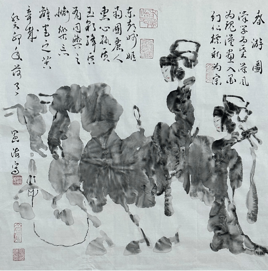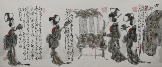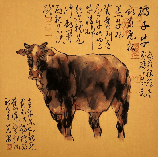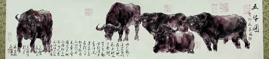 王阔海先生画牛,可以说是千姿百态,帧帧不失大写意之魂。或卧牛、行牛、耕牛、牧牛, 或单牛、双牛、群牛,或老牛、小牛、母子牛,或食草牛、小憩牛、孺子牛,或凝目、回眸、俯首、哞鸣,或牛气冲天,或天牛卧看(题跋杜牧《秋夕》:“银烛秋光冷画屏,轻罗小扇扑流萤。天阶夜色凉如水,卧看牵牛织女星。”),皆刻画惟妙惟肖,多一笔嫌碎,少一笔不够,深得大写意精髓。既写实又写意,是王阔海先生既不与前人同,也不与现代李可染相同的自家画法,由此把中国画大写意画牛,推向一个更高的高度。 王阔海先生画过两幅《五牛图》,其中一幅画四头牛和一只小牛,一头俯首,一头昂首,两头目视前方,小牛依偎在母亲身边,形神兼备,意趣盎然。长题跋于左下方,参差错落,延伸至左边牛四蹄下,如一片草坪。其题跋曰: “冰冻雪寒牛背暧,夜沉风吼不思归。忽听娘亲声声唤,泪眼婆娑只有回。柳绿草青花正艳,哞哞奋起踏春来。郎骑牛背书声亮,遍地芳菲尽落台。步履蹒跚低俯首,犁痕作浪汗成畴。只为仓廪粮常有,戴月披星尽瘁酬。” 观之读之,另人感慨万千!右边一则题跋,与之遥相呼应,几方印章盖得特别讲究,富有趣味,增加了画面的丰富性与动感,境界美妙,充满诗情画意。这是一幅难得的诗书画印完美结合的精品力作手卷。 李可染先生曾在画作《五牛图》上题字曰:“牛也,力大无穷,俯首孺子而不逞强。终生劳瘁,事人而安不居功。纯良温驯,时亦强犟,稳步向前,足不踏空,形容无华,气宇轩昂,吾崇其性,爱其形,故屡屡不厌写之。”可染先生的肺腑之言,谁又能不说这也是王阔海先生追求艺术之路上的写照呢?