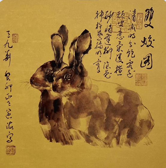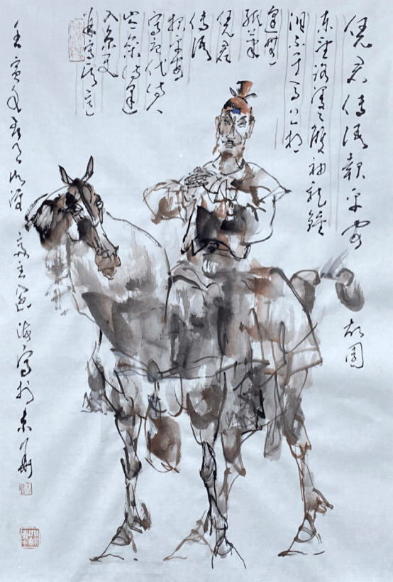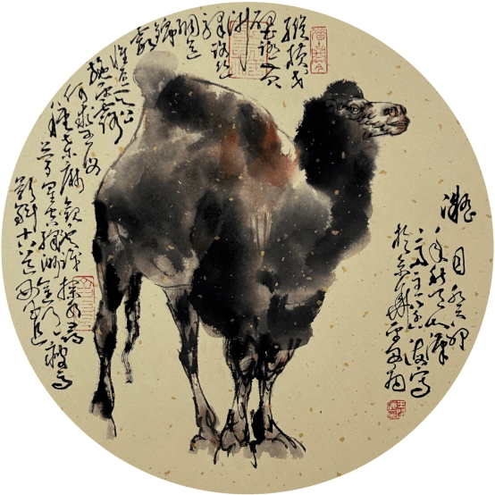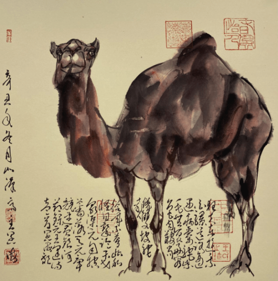 最后,我们看王阔海先生画骆驼。现当代有吴作人以画骆驼闻名,但他用的是西画的画法,以块面造型见长,虽用水墨但并非中国画的笔墨。其骆驼头部也太为概括,不免失于空洞。与吴作人先生相比,王阔海先生画骆驼,用“中国画素描”与以线造型融合的“王阔海六法论”,画出的是既写实又写意的大写意骆驼。特别是那两幅《任重道远》和《小憩》图,气势宏大,其造型极为结实而深入刻画,笔墨姿肆汪洋,水韵墨痕顺机生发,笔情墨趣自然滥觞,足以看出明清徐渭、八大之笔墨遗韵。无怪乎中国美术史论家刘曦林先生对王阔海先生赞曰、“承接了八大徐渭续接至今的文脉精神,成为极少数承薪接火之人。”再从王阔海自题的一首七绝的后两句诗“今时亦失文长墨,斯图似出雪个庐。”足可看出王阔海先生的文化与艺术的自信。 由于篇幅所限王阔海先生画其它动物比如羊、兔、狗等动物,以及更具体的作品比较也只能暂且割爱了。 庄子语云,技进乎道(庄子《养生主》:“道也,进乎技矣。”)。心中有道,有天道、人道、艺术之道,自然之道,才能绘出画之道,而最终归于老子“道法自然”之道。王阔海先生大写意动物走兽,可以说达到了神刀鬼斧,游刃有余,随心所欲不逾矩的自然大化之境界!至此也可以说近百年的“中西合璧”亦或是“中西融合”经过几代人的共同努力已经达到了“融合中西之长”亦或是“洋为中用”之“为我所用”的最完美阶段,而王阔海先生则是这最后阶段的炉火纯青之人。 癸卯盛夏于京都西山