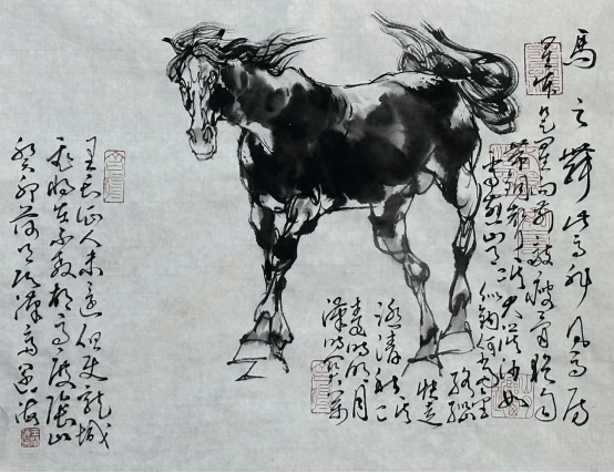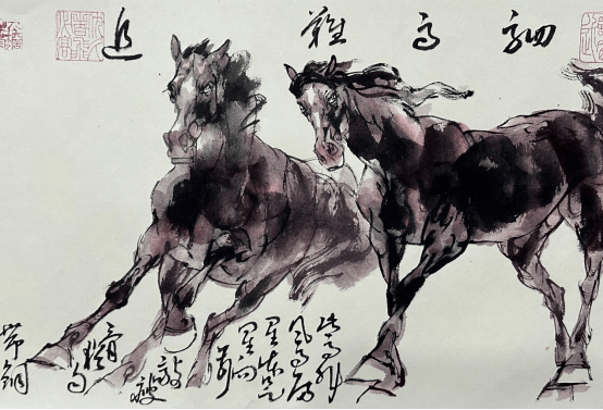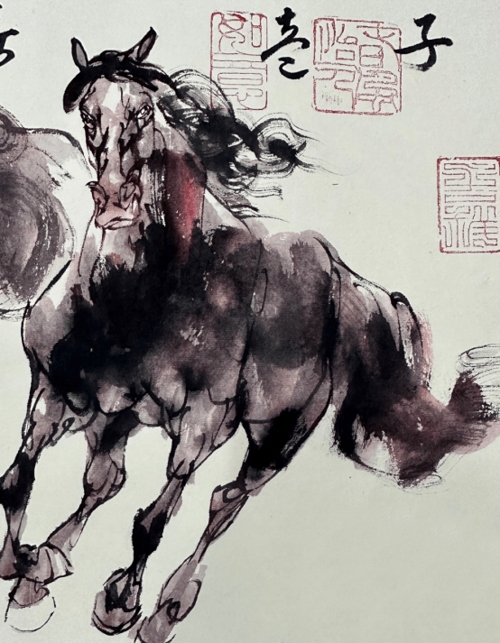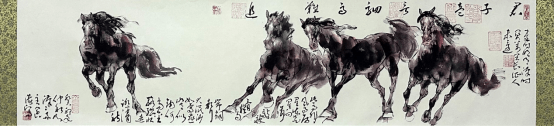 即是说,徐悲鸿创立的素描造型体系,没有完成中国画变革的使命。后继者更是把中国画画成了西画。不可否认的是,它对中国画的作用、意义和价值,也是无可取代的。 就中国画本身而言,其素描造型对中国画的改良有着更为本体和本原上的意义。而整个中国美术教育,无不是建立在徐悲鸿中国画思想和教育体系之上。然而,沿着这一路径下来,当代中国画越来越不能承担和负载起传统中国画博大深厚的精神,即中国画的精髓——文人画传统。故此,如何既继承上一代大师开创的素描改良中国画的优势,又能使其承载传统中国文人画的精神,使二者兼得,摆在了有责任和担当的画家身上。问题只在于,如何将徐氏的创造与中国画传统笔墨进一步深入结合,而不是跑偏去画西画。这是一个看似简单但实践起来却并不轻松的课题。经过几十年的探索,王阔海先生解决了这一大难题,完成了时代赋予的历史使命!与徐悲鸿的贡献同样对当代中国画起到了巨大的推动作用。 当然,徐悲鸿作为中国画大师,是爱国主义的典范。在徐悲鸿的作品中,随处可见他的爱国热忱,无论是历史主题还是现实题材,无论是“奔马”还是“雄狮”,都体现了他热爱祖国和人民的情感。其作品在具备美术史意义的同时,赋有显着的象征意义,反应了一个时代革命与新力量的壮大,具有很深的感召力,有着属于那个时代的浓厚时代烙印。 今天,美术的作用同样不可估量。马的的忠诚与高贵,奔腾不息、不可征服,与人类同生死共荣辱,是人类最忠实的朋友。骏马奔腾的的神韵,更是画家笔下屡见不鲜的形象,被喻为天马、动物中的龙,同曰为龙马精神。王阔海先生笔下的马,与悲鸿先生笔下的马同样具有这种奔腾不止的精神品质。有所不同的是,悲鸿的马因呼唤时代精神而具有一种概念化的倾向和特征,而王阔海先生画的马则更加丰富生动,既具有龙马精神也具备人间情味,既是龙马的人间化身,也是人的精神面貌的物化形式在马等动物身上的艺术化表现。所以,王阔海先生画的马等动物,能得到爱好者的极力追捧,一经脱稿即被藏家争相收入囊中。 究其原因,除了精神上相通之外,与悲鸿先生相比王阔海先生画马于传统笔墨上的回归,并独创“中画素描”以线造型,使得画面更加充实而丰富,从而在画法上实现突破并奠定了坚实的基础。