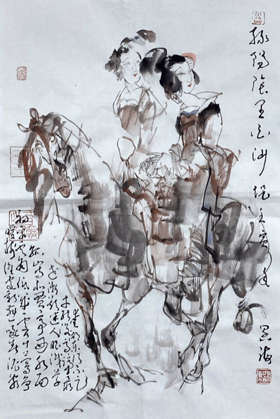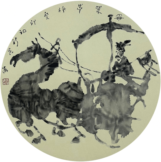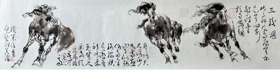 比如王阔海先生创作的一幅《百马图》,是其中的代表经典之作。该作充分运用自创的“中国画素描”与中国画传统中的散点透视相结合的法则,创造出结构坚实立体感明显,而又左右延展,视觉广大,令观者随长卷放眼以观万马奔腾之势,给人一种气势浩荡,万马奔腾嘶鸣,一如冲出画面的强烈视觉动感!近而细观,则每匹马动态各异,体态健壮,骨感突出,体积方圆,肌肉隆起,线条劲利,一派铁画银钩老辣枯苍。大有宋代陈抟所言“开张天岸马,奇逸人中龙”之感概。在这里西方的素描油画诸因素悄然融化入中国画笔墨、水墨之语素而浑然天成;文人画的笔走龙蛇与线面结合的神出鬼没,笔墨的姿肆汪洋,流落洒脱,水渍墨痕的交融幻化韵味无穷,构成了一种墨的奇幻,韵的旋律、线的交响。使近百年的中西合璧进入化境。这对那些将中国画画成了油画和水粉画的所谓“中西合璧”者无疑是一种极好的榜样和警示。 徐悲鸿之后,则有韦江帆、刘勃舒继承徐悲鸿画马,把徐悲鸿画法中的某种因素放大,创造出更为大写意的画马之法,可以说用的是徐悲鸿画法中的减法,而王阔海先生用的则是除法和乘法,除去西画的光影,再乘以中国画的笔墨。 如果说悲鸿画马可以喻为“致广大”,那么王阔海的画法则既“致广大”又“尽精微”。王阔海先生在注重整体精神面貌的同时,在局部上进一步具体而微之,刻画骏马更丰富细致的表情、形态等动态形象,无论奔马、立马、跃马、群马,还是侧马、回马、背马,或神采英发,或遗世独立,骨力洞达,活泼灵动,生机勃勃,同时在笔墨运用上把大写意画马推到了前无古人的一个极致。