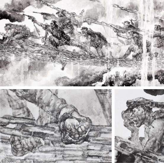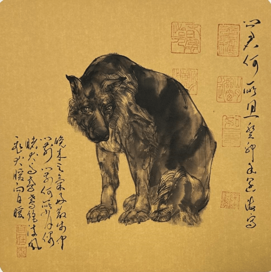 当代画动物的高手不乏其人,王阔海先生则从中脱颖而出,以独特的画法开创了中国画大写意动物的崭新局面,把徐悲鸿等上一代画家在中西融合中尚未完成的创新,向前推进一大步,从本质和本体上,彻底解决了中西融合的历史进程,使之西方油画素描造型诸元素春风化雨般地被溶入到中国画语素当中去,可谓"润物细无声”哉。把中国画动物画在写意之写实方面刻画的更为深入,物象更为贴近,造型结构更为结实,体积感更为强烈,墨色变化更为丰富,笔情墨趣更加饶有兴味,且全都是书法用线铁画银钩笔笔精准到位,笔墨则酣畅淋漓,大有八大,徐渭文脉遗风;既继承发扬了文人画诗书画印四者并举的特质,又将古典主义、学院派、文人画、西方绘画融会贯通,真正做到了古为今用,洋为中用,使近百年的中西合璧这一历史命题得以基本完善。成为新时代大写意中国文人画的又一座高峰。其坚实的基础,除了最基本的中西绘画训练之外,是王阔海先生所独创的“中国画素描”理论为依据,以及以“汉学为基,汉风为魂,汉画入墨,幻化标新。”莸国家发明专利权的新汉独创为艺术制高点,更以诗文和坚实的书法功底,作为文人画大写意动物画艺术高峰的支撑平台(有人为此比喻王阔海的画是艺术上的马云)。在之前的两篇文章中,我们已经就此作过概论性的分析,本篇则对王阔海先生的系列动物画与现当代同类画法进行比较,以见其独特的创新与艺术高度。