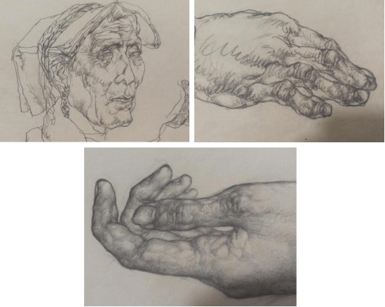 第四点,线面结合。哪些地方行于线,哪些地方进入面,在以往各大院校教学中不太明确,而在王阔海的中国画索描理论中得到了明确;即骨感强与平缓处行于线,而形体转折处进入面。而臻此佳境王阔海先生则采用两个方法实施完成:一是在行笔时候由平缓至转折的地方由中锋变则锋而进入面,二是在转折处以重色贴近墨线轻糅使之墨线自然进入体面关系中去,这使得线面结合达到出神入化的程度。观王阔海先生作画一枝笔恰似游龙,时而中锋行线时而卧笔则锋,时而里出时而外进,上下回旋,左右连贯,笔笔到位,结构与形体在笔走龙蛇般的线面结合运行中顿然而出,直若行云流水,出神入化。 第五点,塑造形体。徐悲鸿画马能致广大,马的大块结构,骨骼肌肉在分块分面的西式法则中,加之中国画的用线施墨,使悲鸿马骨髂强壮肌肉团块突出,非常有大将之风范。而王阔海先生之马既具有徐悲鸿先生的致广大之精神,又在尽精微处更迈出了一大步,那就是塑造形体。比如徐悲鸿画马,鼻梁只是一道明暗分界线,眼睛只是黑墨点到为止,不画眉弓,未免失于空洞与概念化。要把眼睛画得长在眉弓里,牛的眼睛,马的眼睛,都是长在眉弓里,才显示出其骨骼,结实而富含变化。王阔先生画马在线面结合的关健部位,比如马鼻子的转折处用重赭色施加,一下子将鼻子向上走向与鼻子向下走向两个空间拉开,更增加其空间感。再用一点色墨相调配的次重色墨在诸如眉弓、内外眼角鼻粱、腿的结构和身体的体面转折处紧贴着墨线使之少许轻揉而使墨线的转折更自然细腻的进入体面之中,从而使眉弓更加隆起,眼角眼窝更为生动,脸颊形体更为方圆,形象更加逼真,笔墨更加贴近形体。使马面的英俊,牛头的倔犟跃然纸上,活灵活现。这也可能是王阔海先生的砚边密笈,但我却发现此种方法确实是实现塑造形体的绝佳方法,使中国画的意笔写实又向前迈出了一大步。