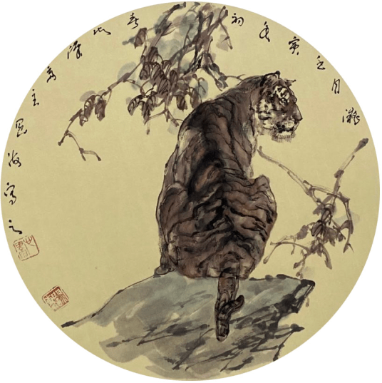 在中国古代,由于狮子是外来物种,画狮子是由画师或工匠以画谱口诀来完成的,在民间传说当中更多将狮子塑造为正义、吉祥、庇佑人间的灵兽,通过画谱为蓝本描绘出的狮子形象,只带有吉祥寓意的模糊形象。进入新时期,狮子被赋予新的象征符号,如果说在徐悲鸿等上一代画家笔下是带有悲壮色彩的写实形象,那么到了王阔先生这一代画家笔下则赋予和塑造为新时代中国崛起的真实写照,作为两代绘画大家,将动物走兽大写意都画成了一个时代的中国画典范。在新时期王阔海先生以新的画法,把徐悲鸿大师开辟的中西合璧之路向前推进到一个新的高度。 狮子之后,我们再看画虎。 在现代画虎的名家中,张善孖,高剑父高奇峰兄弟,胡爽庵,刘奎龄、刘继卣父子,冯大中等画家是其中的佼佼者。 张善孖(1882年—1940年)是张大千的二哥,画虎成癖,以画虎名噪一时是近代中国画虎第一人,人称“画虎宗师”。张大千也因为尊敬他而立誓不再画虎。张善孖笔下猛虎,既不失虎的威猛,又富有人性,含有一种温情。林语堂曾称赞道:“他画的老虎,凡一肌、一脊、一肩、一爪,无不精力磅礴,精纯逼真。”因为画得逼真,其笔墨写意性会有所降低。为了画虎,张善孖在家中养了一只老虎,每日观其神态,所以张善孖画的虎比较写实。再有张善孖张大千的弟子慕凌飞,入师大风堂,为实现张善孖的心愿,不负大千的嘱托,历时三十余年完成了中国画坛第一幅《百虎图》长卷,被誉为中国画艺苑中的一枝奇葩,但其画法未出师父左右,仍以逼肖为能事。