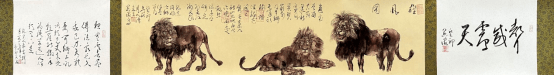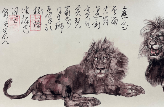 比如王阔海先生的《雄风图》图,画三头狮子,中间一头侧卧正视,目光坚凝,其狮子面部刻画更注重大型体与小形体的塑造,给人一种可触可摸,形象极其逼真,较之前人更为贴近对象!且笔墨轻松自若绝无死抠之嫌,可谓轻松而紧密,疏朗而厚重,可谓形神皆备,不怒而威,亦暗示睡醒后的中华民族这头雄狮力量的自信与坚毅。再看狮子的臀部与两后腿之间的结构刻画的让人称道,后蹄子是底部外翻其体积感与透视都是极难表现的难点,这却让王阔海先生画的自在轻松,微妙微俏,令人拍案叫绝!而狮子右边一头狮子鬃毛立起,“怒发冲冠”,目视左侧,四腿坚实,沉稳伫立,其线与面的神出鬼没,笔与墨的纵横交错,一派浑然天成。其狮子头微抬、嘴开张,作怒吼状可感“声威震天”的主题。左边一头侧身瞠目向右直瞪,与右边两头狮子成互应之势,蓄势待发,迥然有神,鬃毛随风飞扬,呈现出威风凛凛的气势。以赭石淡墨设色,用笔爽气明快,结构简洁精准,表达出一种果敢坚定的力量和昂扬向上的精神。 再一幅《王者之气》,狮子虽身卧而雄姿挺拔,筋骨强健,看上去气定神闲,画出了狮子不怒而威的王者风范。随着画面走势作草书题跋,或长或短,或大或小,错落有致,与狮子的姿势相得益彰,反映出王阔海先生随心所欲的画面把控能力,诗书画印浑然一体的文人画特质与韵致。同时也透露出,王阔海先生作为一位画家其坚定自信的“王者风范”,蕴含着作为一位艺术家对中华民族必然复兴的文化自信。而这种风范,是徐悲鸿一代大师在那种国破家亡的特殊年代所不具备的。