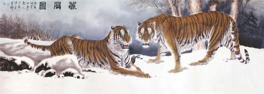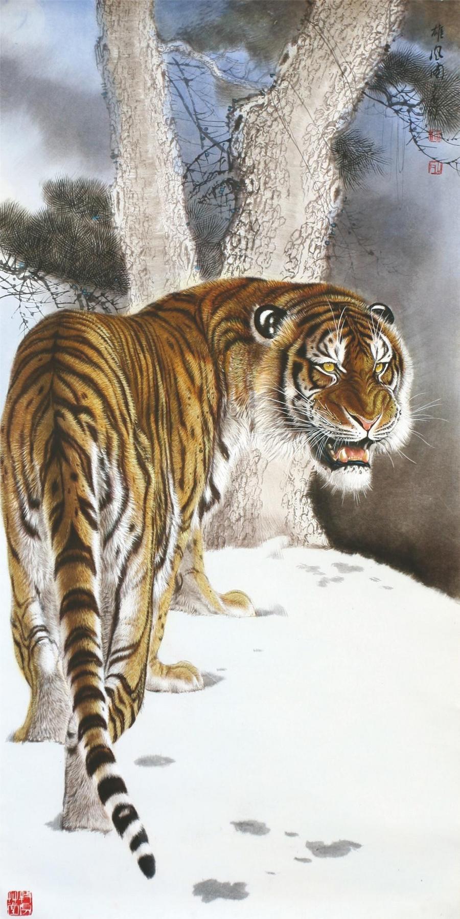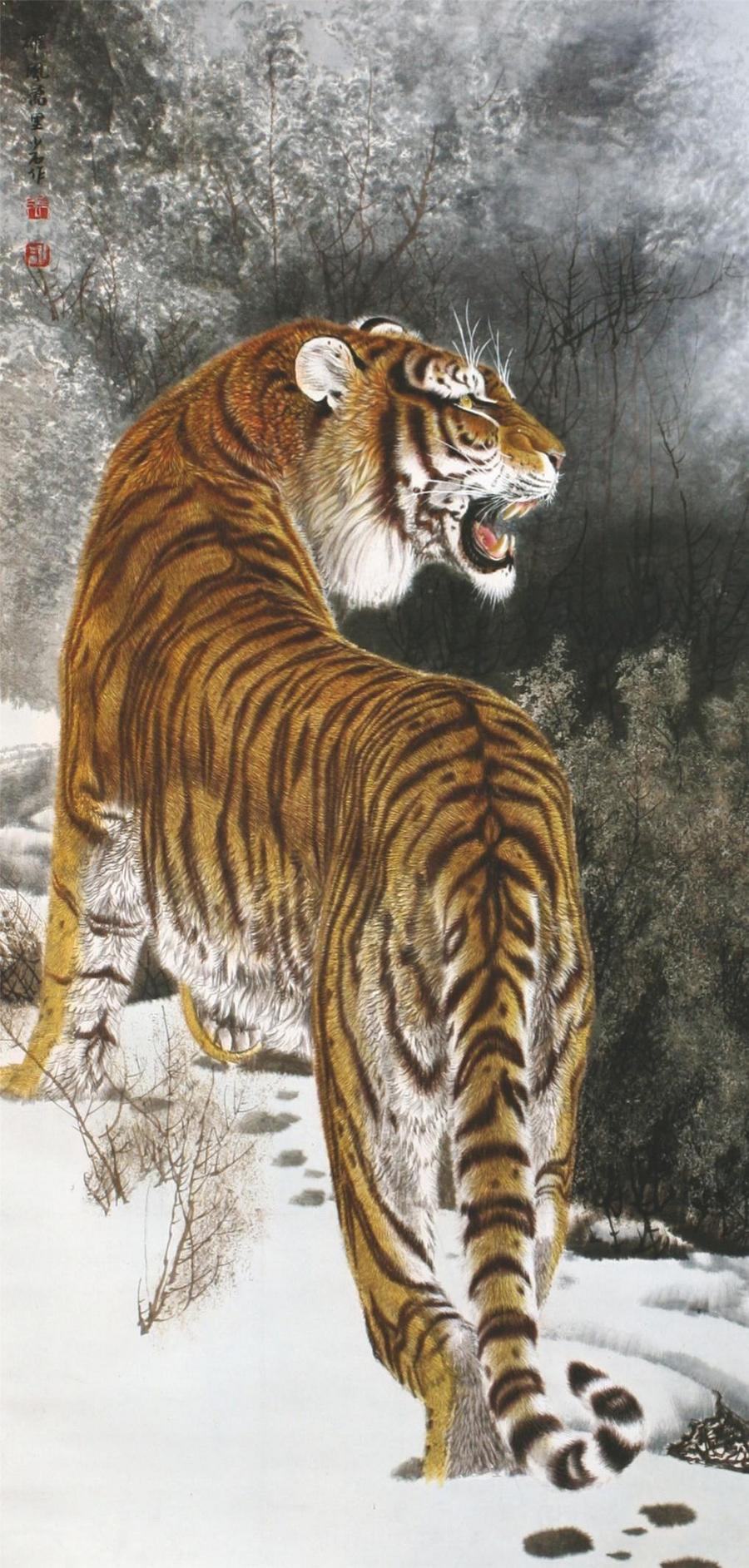 《雄风》 庄子曰:“澹然无极而众美从之”。张少石多借助大写意技法,用笔、用墨与用水并重,对画作背景做极其简约的处理,营造出玉宇澄清的高洁氛围,烘托出“静故了群动,空故纳万境”的幽玄禅境。白雪皑皑、苍茫萧索的深林雪野与老虎孤高傲岸的秉性构成了和谐完美的统一,深蕴远离尘嚣、宁静致远之美。
