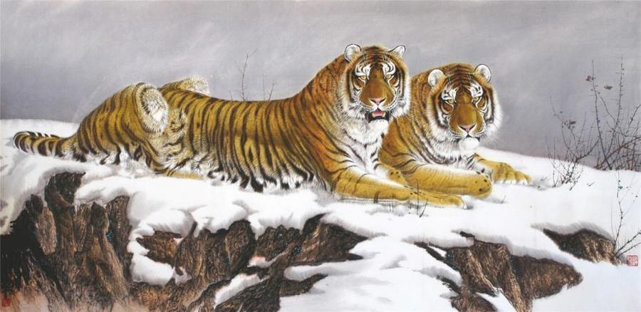 《雄风万里》 古今画虎者众,风格繁杂,各有千秋,其中亦不乏大家圣手。可谓前人之述备矣,后人难以再作新声,故而当今的虎画创作鲜能对虎作新的艺术诠释。虽然也有画家做过一些有益的尝试,但多限于技法层面和表现程式的创新。而张少石却独辟蹊径,在虎的立意上实现了新的突破。他在追求形神兼备、雅俗共赏的基础上,遵循中国传统的“天人合一”思想,将自身的禅学理念融入作品,赋予画中之虎禅性与静态美,打破了自古以来崇尚表现虎之凶残与动态之积习,使作品超越了形而下的层面而进入形而上的境界,具有了深厚博大的精神文化内涵,传达出了画家的美学理想、人文理想与社会理想,形成了独树一帜的画虎新风。