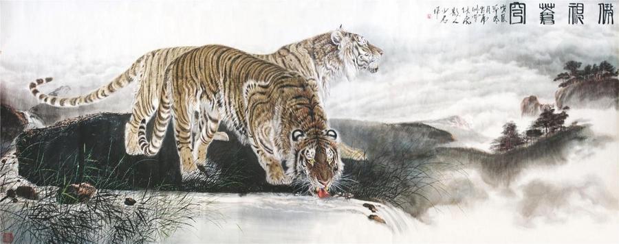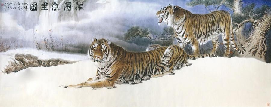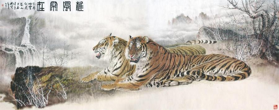 《雄风万里图》 虎历来被奉为驱逐邪恶、趋吉避凶的神兽。张少石笔下之虎极具“百兽之王”的傲骨雄风,兼有佛家之庄严慈悲、儒家之敦厚仁和、道家之仙风道骨。妙明真心,圆照万物,昭示出一种王者至尊的大气派,大智慧,大自在。悬之于高堂,顿觉风气泰然。观之则心定神安,百虑皆除。