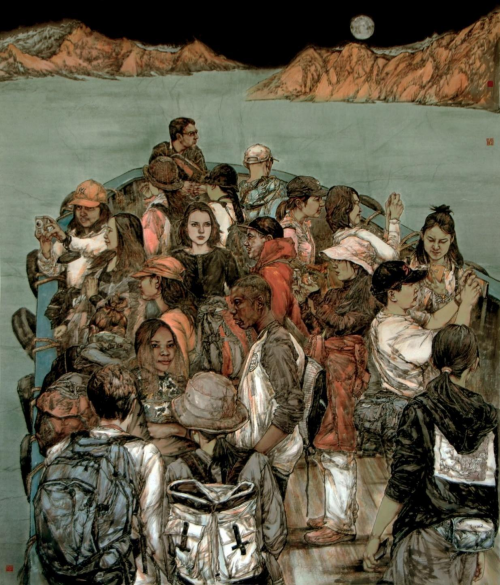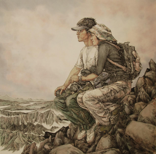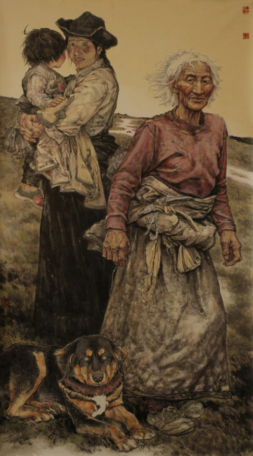 《山河》200×200cm 2011年入选金陵百家中国画展 2009年9月 人物题材的广泛摄取,也同样可以说是刘艺青先生今日表现其自身画功的一个基础所在。所绘人物形象,上是可取于诸多伟人与名家,下亦是可见于民风群众之淳朴。前者伟人形象题材多是以历史的厚重底蕴为本,是谓诉其之功绩而又宏其之精神!而后者的群众人物形象题材,则又是多以地域性表现为创作主旨,或兼具风情韵味,或饱含沧桑质感,如此沉郁的生命情怀和淳朴的民风底蕴,在这一刻已然都是有被刘艺青先生升华到了极致!