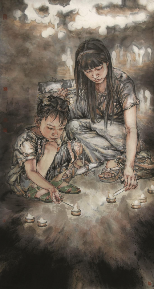 《回家过年》200×145cm 2007年入选第三届中国画展,2008年入选第三展青年美展 2007年 明理的艺术史家清楚,传统是一把双刃剑,一方面为当代画家提供丰富、成熟的传统绘画语言,使其能在较短的时间内接通文脉,并选择适合自己情感表达的绘画语言符号;另一方面,高度程式化的中国画传统,往往使众多画家难逃程式化的牢笼,从而泯灭个性,失去自我。在中国绘画发展的长河中,经过大浪淘沙,只有那些继承传统又能突破传统,形成自己鲜明艺术风格的画家才能沉积下来,成为他们所在时代的代表画家。