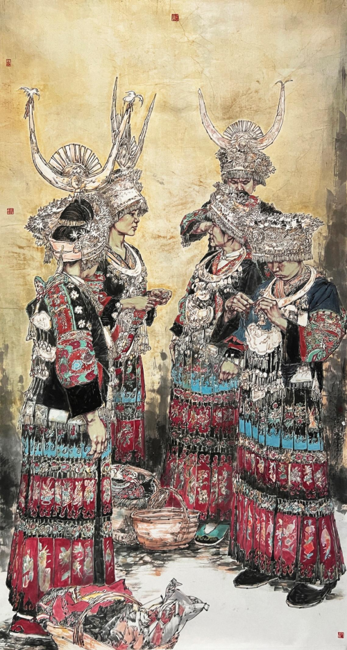 《苗寨女红》180×96cm 2021年 在人物画作中所呈现出的精神交集。潜心人物画作丹青,积淀笔墨创作功底,今日刘艺青先生可以说是用其深厚的艺术实力来向我们诠释了那属于时代的文化底蕴!笔墨技法已然是趋于成熟老练,人物立意也同样是有独具于文化内涵,而经由此所绘成的任何一幅人物画作,也都是能给观赏者带来一种各自不同的审美体验和心神感悟!灵魂赋予,难能可贵! 刘曦林:著名美术史论家