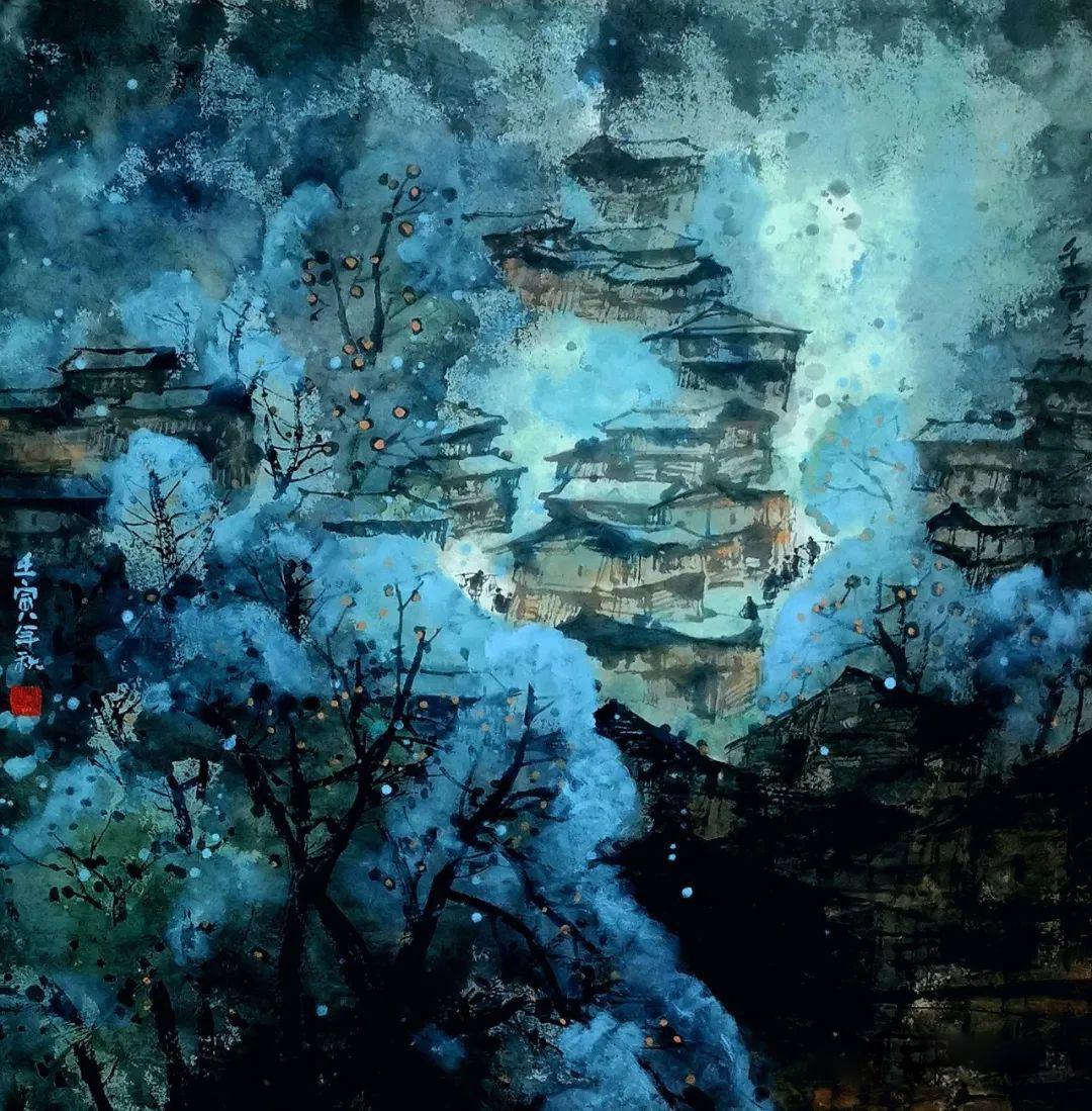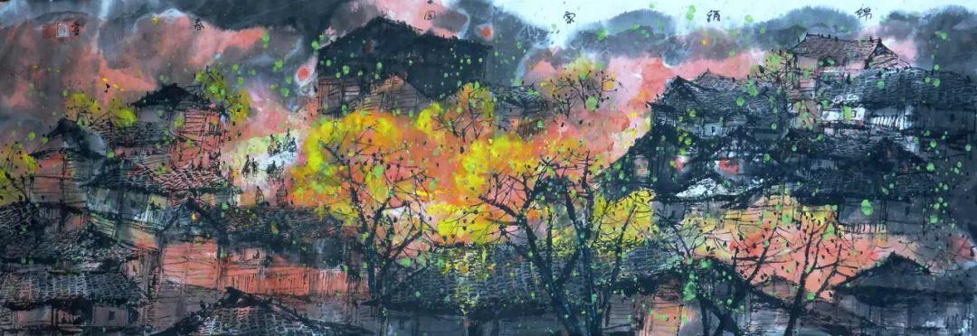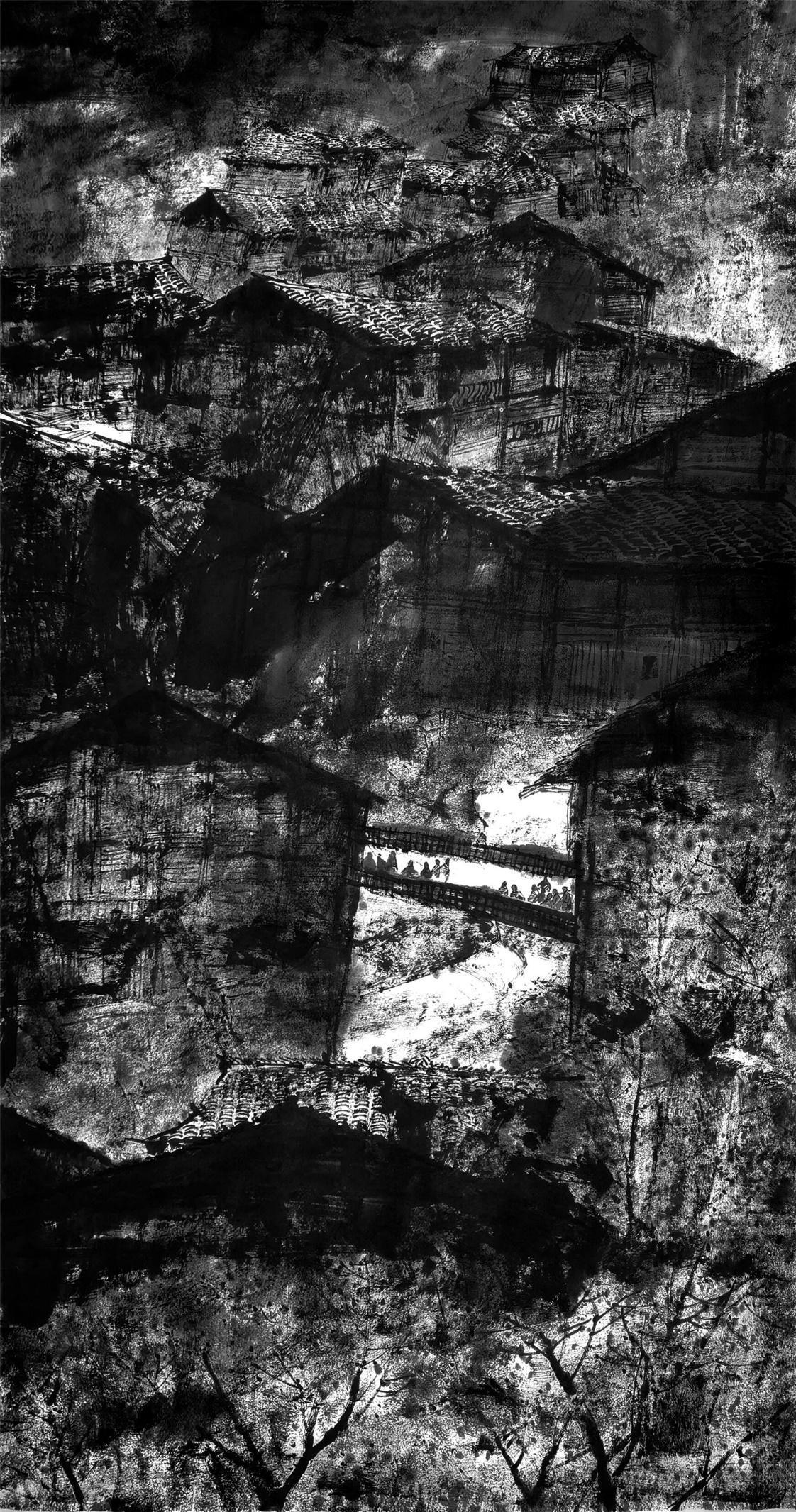 《苗绣、传统村落》 黔东南地处云贵高原东南边缘,东邻湖南,南接广西,境内居住着苗、侗、汉、布依、水等20多个民族,民族风情非常浓郁。这里有闻名世界的美丽苗寨西江、岜沙、大歹……和被誉为人类最后精神家园的侗寨肇兴、车江、大利、地扪、小黄……,这里有独特的吊脚楼、风雨桥、鼓楼,这里有如天籁般的侗族大歌,有让人眼花缭乱的刺绣、银饰、蜡染……这些极具地域和民族特色的东西都或多或少的闪烁在陈明春的画作里,与是画作里拥有侗族大歌一般的宽厚,有苗岭飞歌一般的悠远。多彩的黔东南一直保留着古老的传统,一直坚持着民族文化的自然传承;这里一直以开放的姿态吸收着一切外来的先进文明和思想,在这片丰腴的土地上,一切与之相遇的文明和创造都推陈出新的开放出奇异美丽的花朵,结出甘美的果实,陈明春的水墨探寻不正是在这片土地开出的美丽花朵吗?