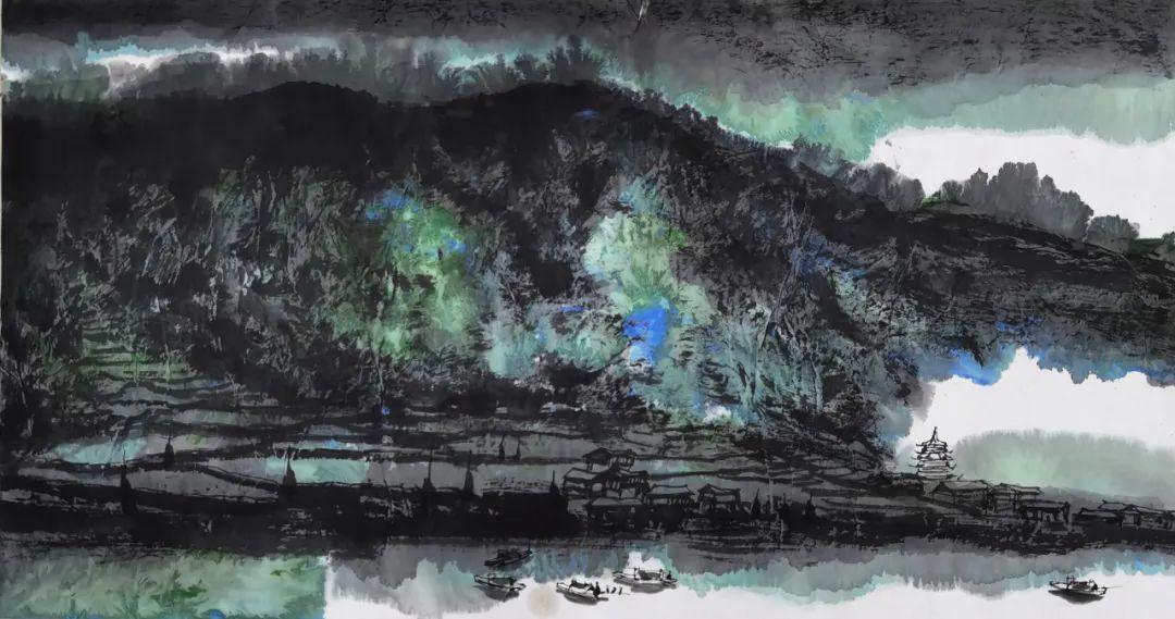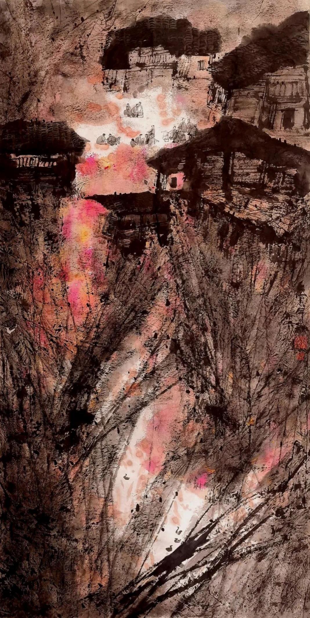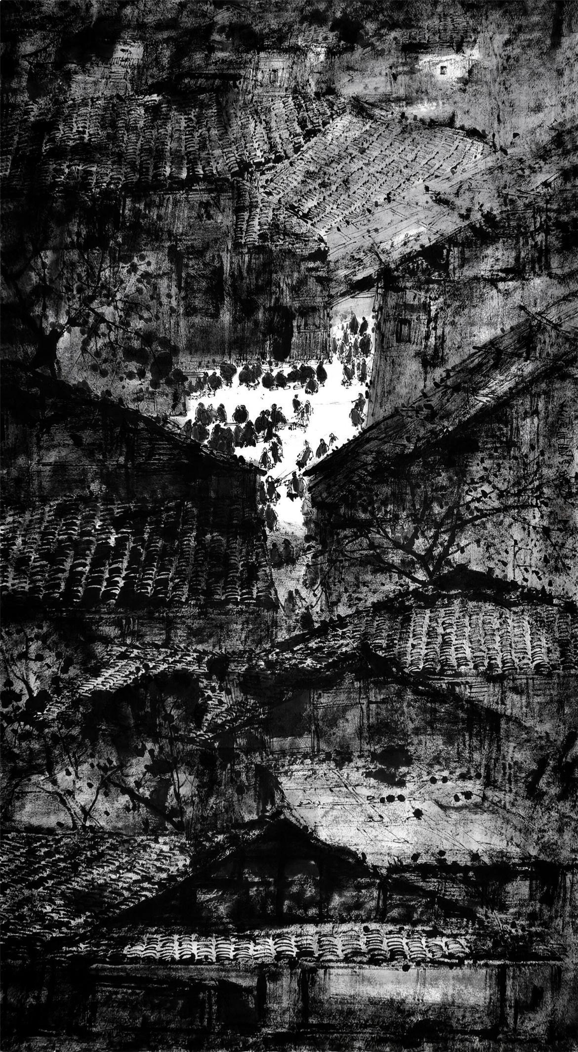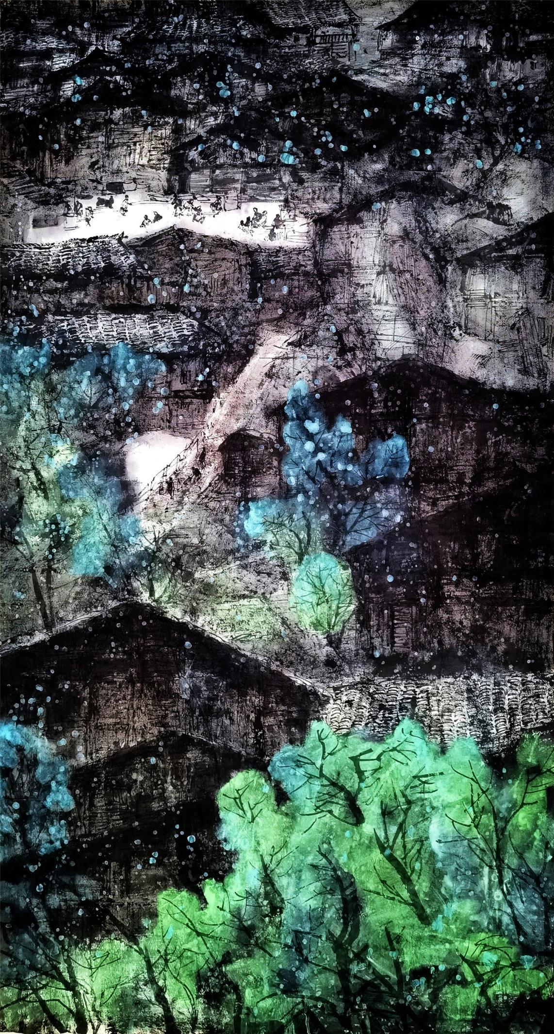 《赶乡场》 苗、侗、布依族先民在与自然和谐相处的长久的历史长河中,不仅留下了绿水青山,成就了当代人们向往的纯朴的诗和远方。 在黔东南众多的“中国传统村落”里,古香古色的民居,云卷云舒的田园,高大挺拔的古树,给人以水墨画一般的视觉感受,给人以“守拙归田园”的诗一般的景像。穿梭于石板小径、田间地头之间,感受现代与古韵共存的独特魅力,宛如来到世外桃源。陈明春水墨画里的氤氲与云气的流动很真切的传达了这里的环境、气象和生态。