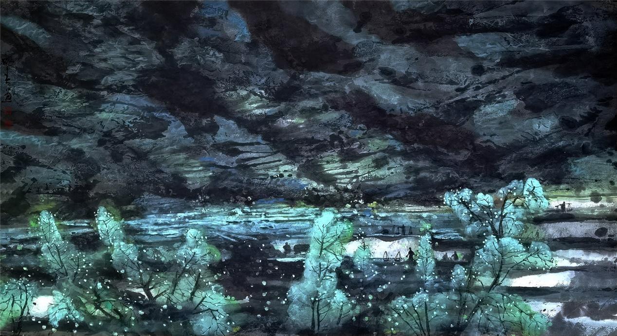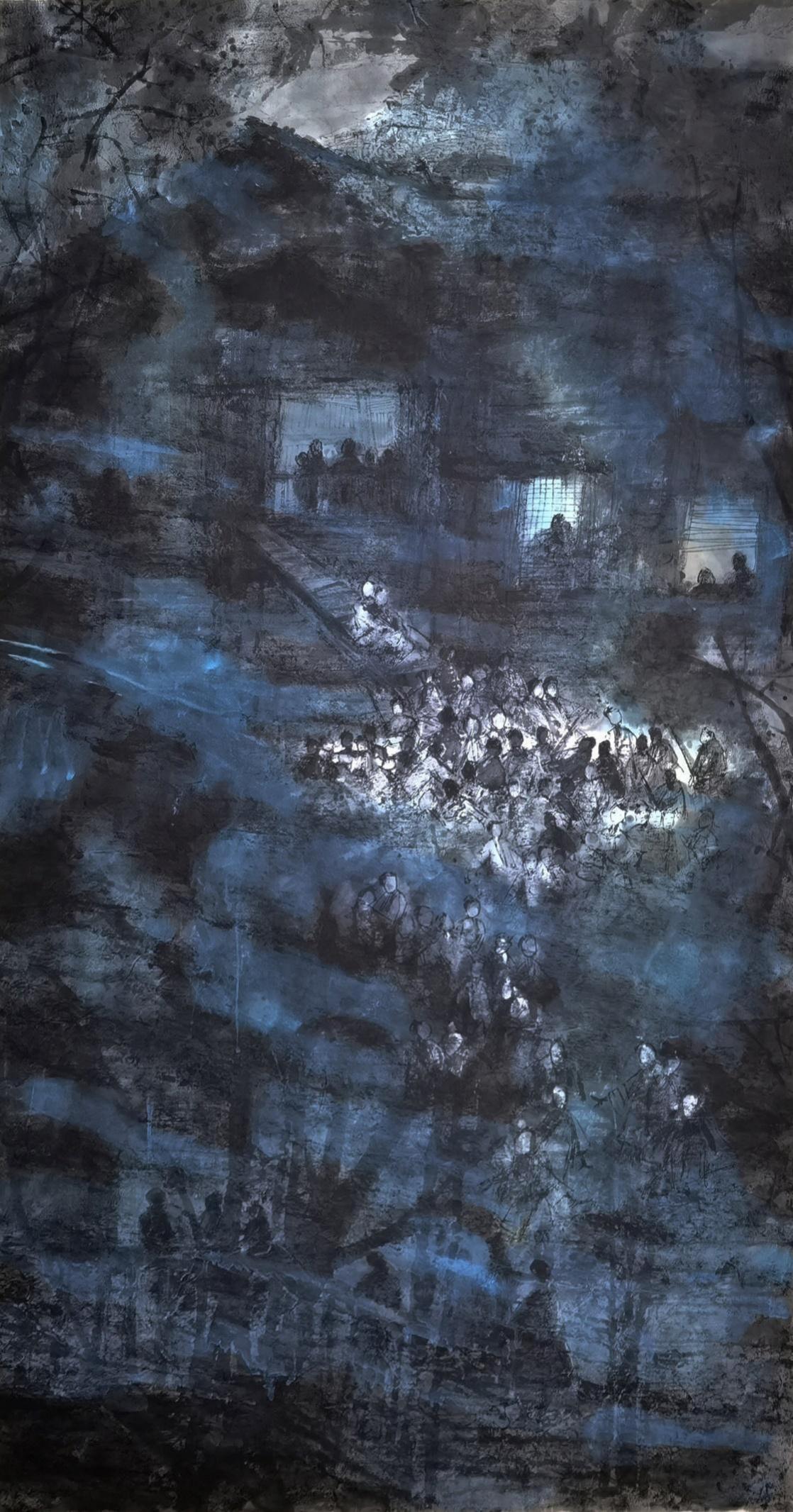 陈明春的水墨创作关注正在远去的文明和时代蓬勃发展的背影。一脉相承的文化行走在时间的长河中,与我们相遇,被艺术灵感捕获和表达,成为文明发展前行的力量源泉。 艺术以感染人作为其生命体现。每一件作品无可取代的唯一性是作者情感、时间、思想的一次交付。除此之外,陈明春的水墨作品还多出了一份对于水墨和时间未来的冒险和延伸。他总想冲破那个无形的边界,不感动自己不精疲力竭不罢休的一往无前。正因为如此,水墨有了跳动的脉搏,艺术才有不死的精神。所以,才有夜行者向光明的使者致敬,每一次艺术探索的彼岸都是那缕从思想的深谷里采撷到的火光。