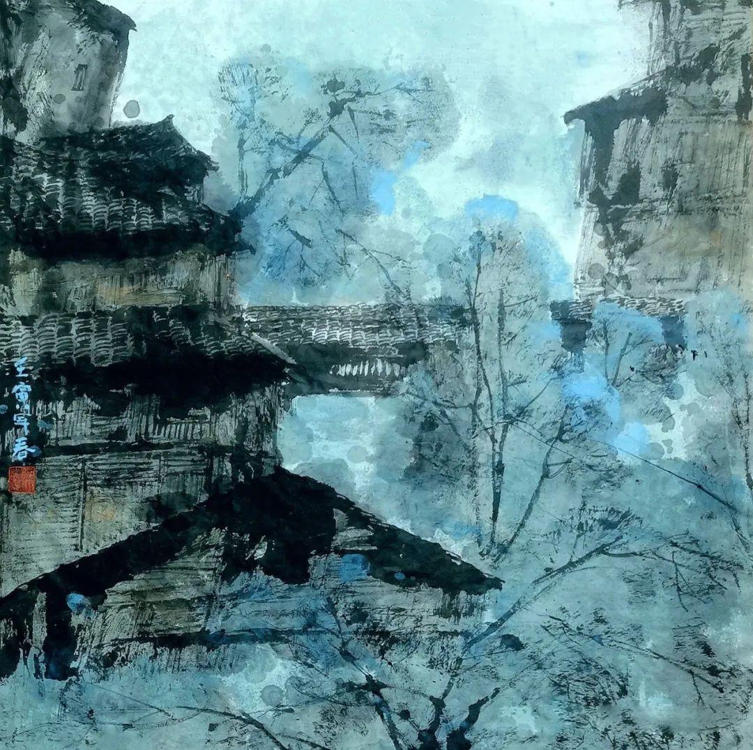 在侗寨里行走,随处可见妇女们槌打、清洗、晾晒侗布的场景。走在小巷中,抬头便能看到随风飘荡的侗布,弥散着蓝靛的味道;也会时不时地听到此起彼伏、或近或远的捶捣声。从靛染、浆色到成为带有哑光的成品侗布,普通白布要经过近20天的“千锤百炼”,这是侗族延续的传统,也是侗寨里靓丽的风景。画家陈明春用排刷应用于水墨创作,如同深深浅浅的侗布晾晒在屋檐和村旁。 陈明春的画里表现了黔东南这方土地上的这些风物、风情、风景,表现了这方土地的村村寨寨、山山岭岭和沟沟豁豁,甚至是角角落落。这些深藏大山深处的美与神奇蕴藏着大山深处的精神。