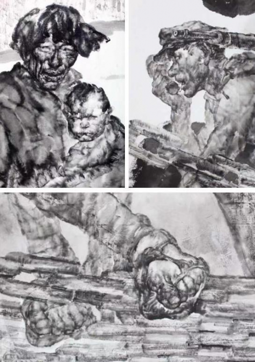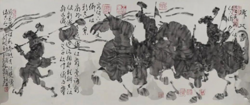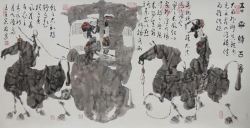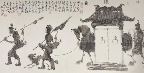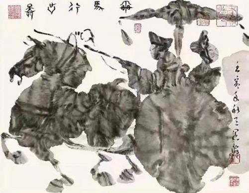 用中国画素描密码和“四要素” 的理论方法进行中国画创作,从素描稿到下笔落墨的整个过程,我们从王阔海先生作品中能看到和感觉到他心应其手、心手双畅的作画境界。2012年,王阔海先生参加全国大展获大奖并被中国美术馆收藏的巨幅革命历史题材《飞夺沪定桥》的素描稿和新汉画的墨法按照中国画素描密码与法则来完成的。该作品在落墨过程中,特别强调突出一个“写”字,充分强调线的表现力,充分调动了玄之又玄的幻化与滥畅的笔墨又使红军形象塑造的结实逼真,使之感觉敲之有声。 三、超越地创造:大写意牛虎鞍马 中国画尤其作为绘画史主脉的文人画,不是强调如何客观的表达对象,而是融入画家本人的主管感受和意念之后的“意向”,所以才叫“写意画”(包括大写意、小写意)。它涵盖了包括笔墨技巧、艺术精神、思想品格、人文情怀、美学特质在内的艺术与美学元素。为此在深入思考与创作实践的基础上,王阔海先生提出了要全面继承中国画之传统,将东方的、西方的、古典的、民间的、现代的,学院派的、文人画的一起吸纳并蓄,创造出不同于古人不同于当代人,但又植根传统新的水墨画样式。 如果说新汉画是一个开始,那么在解开了中国画素描密码和中国画素描四要素”之后,王阔海先生的大写意,亦或是写实的写意方面,在独创的中国画素描基础上,上升到中国写意文人画的又一个高峰:一是继承中的高峰,二是新创造的高峰。最终,二者合一达到了当代中国写意画的最高峰。这便是王阔海先生近几年创造的与众不同的具有突破性意义的大写意动物马、牛、虎、羊、骆驼、毛驴等系列动物形象作品。
