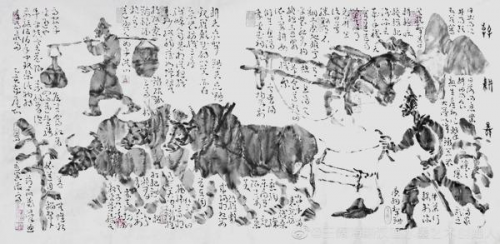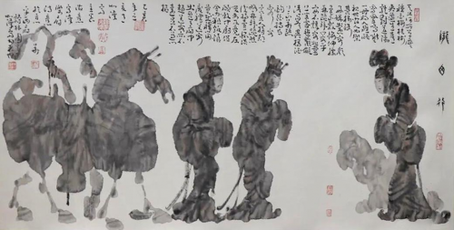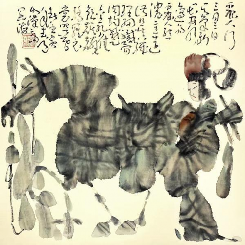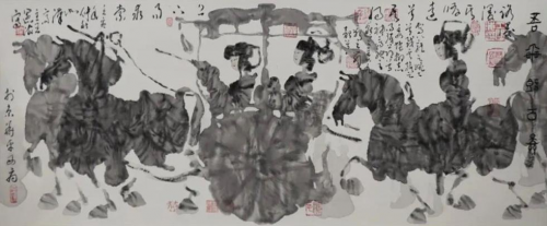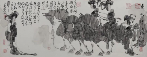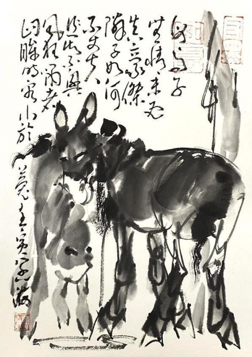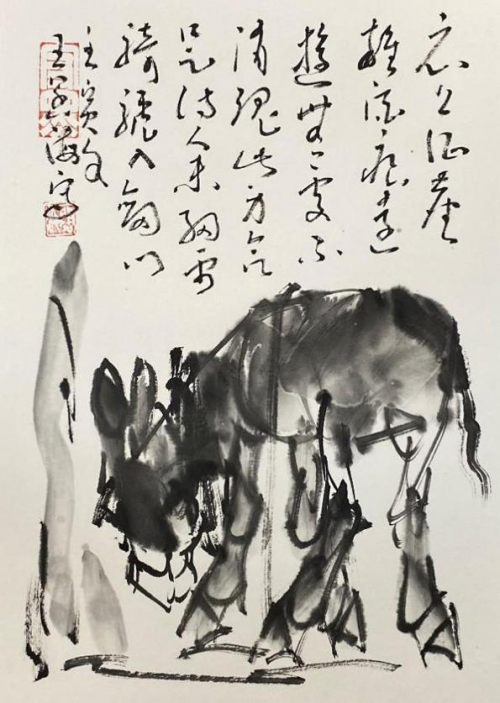 在王阔海先生所画的骆驼牛马毛驴画中,我们应当看到,在继承前人文人画笔墨精髓方面王阔海先生确有独到之处。能够“为往圣继绝学”。我们看到了八大、徐渭、吳昌硕、齐白石等先贤大师的文脉精神在王阔海先生这里得到了延续与宏扬,那更象徐渭笔墨滥畅的笔墨,看似乱画却是乱而不乱却是匠心独运。笔墨纵横交错,水痕墨痕交映叠加成趣,幻化莫测。且笔墨通透明净,语言简洁明快,沒有多余的废话。笔清墨爽而鲜话,且层次极为丰富何止墨分十色可以言尽。陈子庄有言“古今能达到乱画者唯徐渭一人耳”。今见王阔海先生之骆跎驴马牛,其笔墨姿肆汪洋而“乱画”者继徐谓之后吾敢断言还有一人——即王阔海者也。这在王阔海先生的近作《百驴图》中自作的一首题跋七绝诗中可窥先生的胸次:“信笔写来百驴图,散珠摇笔运自如。今时亦失文长墨,斯作出牵雪个庐。”