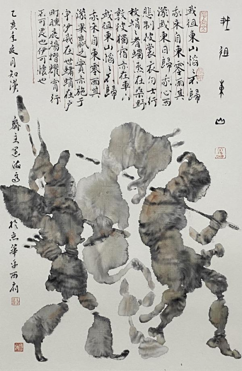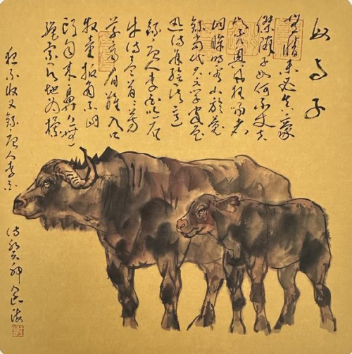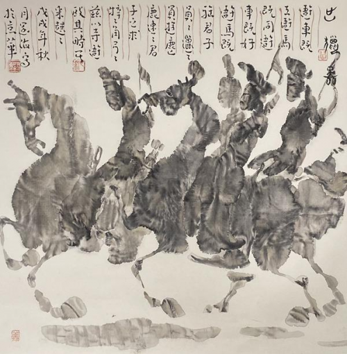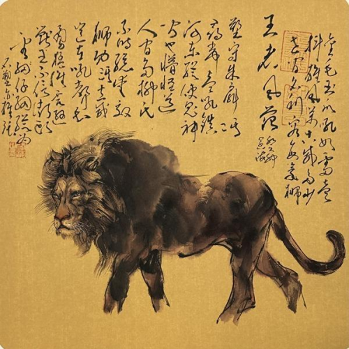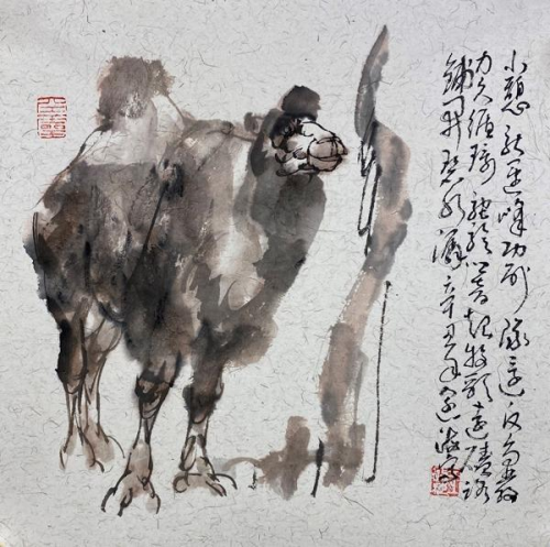 独创新汉画 又创新高峰 ——王阔海的大写意牛虎骆驼鞍马动物系列作品研究(概论) 文/褚哲轮 王阔海先生因创造新汉画技法,在2018年国家知识产权局获得国家发明专利,开创出中国画创作的一个崭新领域。其后继续探索为中国画笔墨服务的中国画素描造型与中国画勾线、水墨相结合,在马、牛、虎、羊、骆驼、毛驴等中国画传统兽畜(动物)鞍马画科中,成功地创造出笔墨韵味浓郁的大写意动物形象,达到了中国传统文人画诗书画印的又一高度,在写意的写实这一动物领域创作出中国写意文人画在当代的又一座高峰。 中国画的每一次突破,都离不开观念的转变与技法层面上的突破。王阔海先生也不例外。笔者在《大汉气象,文人韵致——王阔海先生的新汉画艺术》一文中,在中国画现代转化大背景下,已经就王阔海先生观念的转变与抉择和取得的新汉画艺术成就,及其对新时期中国文人画的贡献,作过研究与阐述。本文则对王阔海先生在鞍马等动物形象的艺术创造,进一步作学理和画理上的(学术)梳理,以期发现王阔海先生独特的中国画素描创造和对中国大写意文人画的贡献之所在。 简单说,王阔海先生创造的大写意动物形象,首先表现在把西方素描转化为中国画素描的创造性突破。为此,王阔海先生解开了为中国画笔墨服务的中国画素描密码,即“一、二、三”的素描与笔墨秩序排列和探索出中国画素描“四要素”,即“以线为主,明确结构,线面结合,塑造形体”,从而准确地找到了一种适合中国画表现的素描方法。而后将其与诗书印相结合,探索创造出独特的笔墨语言,创造出新的水墨造型奇迹,表现中国文人画大写意形象,开拓出当代中国文人画的一道亮丽的风景和崭新的局面。