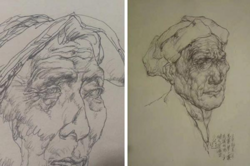 二、重大的突破:中国画素描密码与中国画素描“四要素” 王阔海先生早在1989就毕业于原解放军艺术学院国画系,受教于刘大为老师,在此夯实了扎实的造型基本功和笔墨基本功。2000年王阔海先生又参加了总政艺术局开办的“素描高级研究班”,当时任教的是王华祥老师,由此对素描产生了新的认识,解开了西方大师素描的密码。而这一切收获并没有满足和停止王阔海先生探索的脚步,他继之要研究为中国画水墨服务的素描该怎么画这一困扰当代画家近百年的课题;即强调了素描造型却紧了笔墨,放纵了笔墨则跑了造型这一窘境。 王阔海先生带着对这一课题的思考,即刻赴湘西二炮基层部队和侗乡山寨,以干部战士为素描对象,在田间村头以侗族乡人为模特,深入地进行中国画素描研究,笔耕不辍,大年三十回乡过年,还执铅笔于土炕头上画像于亲朋间。之后,又入川西,陟雪山,过草原,深入藏族、羌族地区写生,画康巴汉子,几年下来,积累了100多幅头像、半身像和全身像素描及300多幅速写。他边画边思考;遇到了这样的结构我在中国画的落墨中该怎样地抽线、行线?那些地方行于线?那些地方进入面?遇到这样的形体,该把最黑的重墨放到何处?中国画抽象的素描密码符号又该是怎样的……