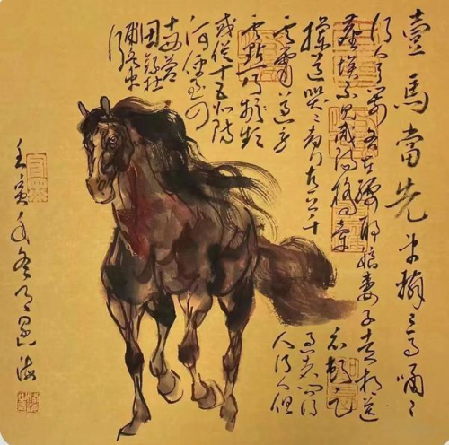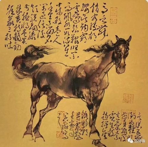 王阔海先生对于鞍马等动物画法的独特创新与贡献可以说是前无古人,除了中国画素描的突破之外,还得益于王阔海先生深厚的书法功底。王阔海先生的书法下了近五十年的功夫,行、草、隶,篆、楷、甲骨六体皆能,特别在章草与草书方面有着高深的造诣和独特的个人风格,业内人士评曰可与明清书家相媲美。王阔海先生所画的物象线条,完全是用书法的用笔勾勒出来,具有书法用笔的韵律变化之美。加之自作诗或古诗的长题跋,画中有诗、诗中有画,诗、书、画、印,协调和谐一体,使画面更加生动和丰富,增加了画面的文化含量,让我们从中看到浓浓的文人画书卷气,所谓“腹有诗书气自华”。