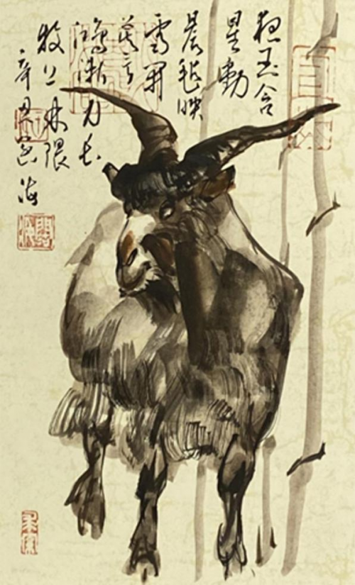 特别是其中的用线,更显现出王阔海先生深厚的书法功力,对线的敏感程度,灵活运用勾线的高深掌控能力,达到了心交神会、游刃有余、炉火纯青的境地。像马头、牛头、骆驼头,包括牛腿、马腿、羊腿等,都是用书法的线条去抽出它的结构线。而在光线的作用下,它可能是在亮处、高光处,但现实中并看不到这样具体的线,而是经过王阔海先生的高度抽象提炼出来。由此把马、牛、骆驼的头、面,画得十分深入到位,以至于看到它的读者都感动不已!这一点,正是王阔海先生与上一代画家比如徐悲鸿、刘继卣等先辈相比,独特创造的地方。包括羊系列作品,刻画得既造型结实又神态毕现,更是前无古人,笔墨韵味十足又贴近对象。