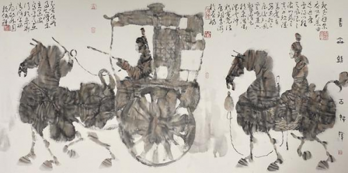 一、时代的呼唤 近百年来,由徐悲鸿引入的西方素描教学体系,西画素描为我所用,使我们在塑造形体方面超越了古人,徐悲鸿的“拿来主义”确实有历史性的伟大贡献,对于中国画尤其是人物画的发展起到了很大的推动作用。但是,中国画与西画毕竟不同,中国画家最终还得画中国画。这种各大院校以学习西方素描为基本教学大纲的教学机制,又加之本末倒署,让笔墨为素描服务而不是素描为笔墨服务,国画创作用笔墨去抠素描抠造型,使中国画作品画的越来越紧,越来越腻,越来越没有了内涵与品味,工笔画盛行,能品可遇,而书卷气与神、妙、逸品不得见,使传统中国文人画水墨渐行渐远,又加之近百年来钢笔字代替毛笔书,电脑代替钢笔字,书法的缺失与诗、词、歌、赋文化之缺失,中国画创作越来越离道甚远,失去了形而上的文人画高度和中国画本就应该具有的书卷气和品位。纯粹的西画素描分块分面、讲究光影、固定光源,表现形象的点、线、面很难揉和到一起,使中国画作品形象支离破碎,有的干脆全盘西化,把中国画画到油画那里去了。近百年的中国画演变发展史告诉我们;纯粹想用西方素描、油画、照片,通过走捷径来实现对中国画的改造之路是行不通的!徐悲鸿先生一百年前只是起到了引进的作用,还沒有完成将西方素描与中國画的彻底融合。只有一方面坚持文人画诗、书、画、印四者并举的修行法则,一方面对西方素描实行为中国画笔墨服务的中国画素描改造,创造出一整套中国画素描、勾线造型、笔墨塑造等表现形象体系,彻底完成新时期中国文人画的重新建构,是当今中国画家赋于的历史使命和任务。而王阔海先生毅然背负起这一使命,在徐悲鸿等上一代大师的道路上向前再行进一步,经过几十年的艰苦探索,破译西方素描的密码,彻底完成和解决了中国画的素描问题,成为当今中国传统文人画的再创者,取得了引人瞩目的成就。从新汉画到鞍马动物,在徐渭、八大、扬州八家以及徐悲鸿等前人基础上,王阔海先生突破传统文人画的局限,独创中国画素描“四要素”,解开了中国画素描密码与要决,从而将前辈在素描造型与中国画笔墨的完美融合上,向前迈出了突破性的一步。
