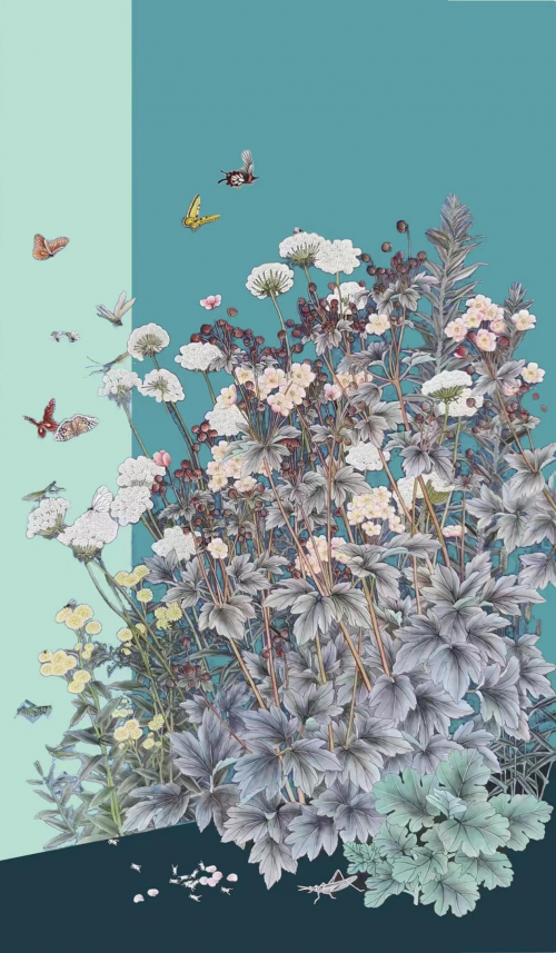 粉彩用水不干不湿,调和的特别“润”,这是他画月季花头的绝秘之法。如若用水过量易显腻,如果用水不足则显枯。反观唐老师依水调粉彩,不多不少,不腻不枯,恰到生态的妙处!以水为道,以粉为器,落笔渲染,恰合纸性。花质与花馨跃然纸上,扑面而来,令人赏析悦目。经过兼工带写的塑造,夺月季精神,掠月季体貌!施粉彩,达成了雅俗共赏的境界,有极好的品读格调,如有风来,迎馨醉赏。